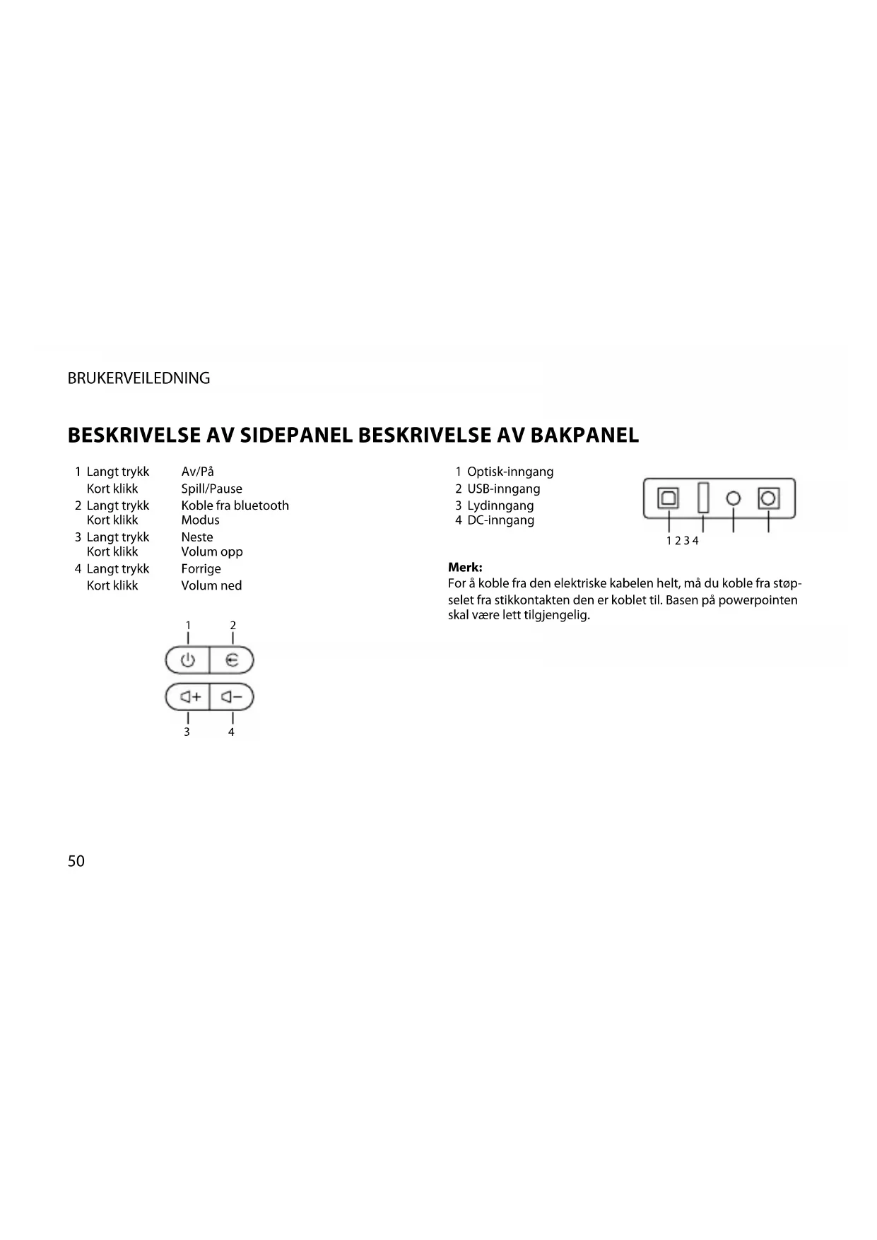 Langt trykk Kort klikk Langt trykk Kort klikk Langt trykk Kort klikk Langt trykk Kort klikk Av/På Spill/Pause Koble fra bluetooth Modus Neste Volum opp Forrige Volum ned Optisk-inngang USB-inngang Lydinngang DC-inngang