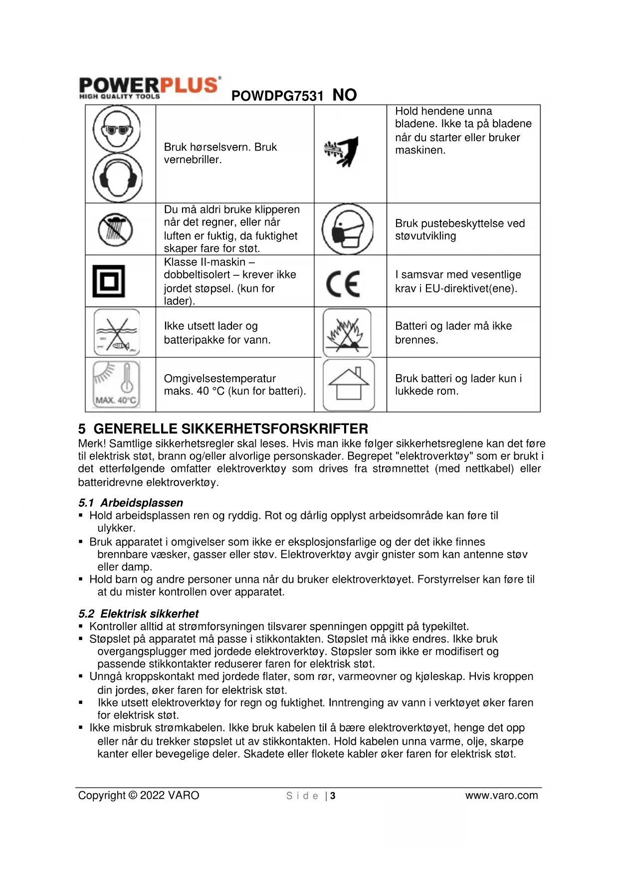 - Ikke misbruk strømkabelen. Ikke bruk kabelen til å bære elektroverktøyet, henge det opp eller når du trekker støpslet ut av stikkontakten. Hold kabelen unna varme, olje, skarpe kanter eller bevegelige deler. Skadete eller flokete kabler øker faren for elektrisk støt.POWDPG7531 NO Copyright © 2022 VARO S i d e | 4 www.varo.com