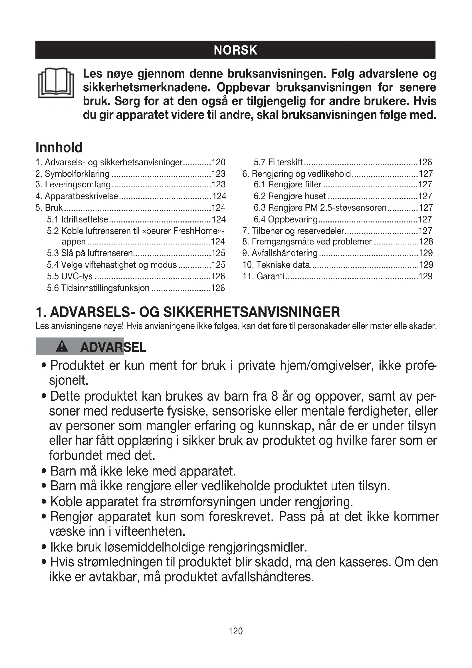 1. Advarsels- og sikkerhetsanvisninger ............120