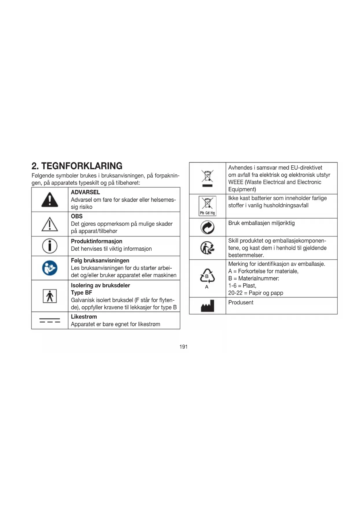 Kontroller leveransen for å sjekke at kartongemballasjen er uskadet og at innholdet er intakt. Kontroller før bruk at appa- ratet og tilbehøret ikke har synlige skader og at all emballasje er fjernet. Ikke bruk apparatet hvis du tror det kan være ska- det. Henvend deg i stedet til din lokale forhandler eller kontakt kundeservice. 1x blodtrykksmåler med mansjett 2x 1,5 V AAA-batterier LR03 1x oppbevaringseske 1x bruksanvisning 1902. TEGNFORKLARING Følgende symboler brukes i bruksanvisningen, på forpaknin- gen, på apparatets typeskilt og på tilbehøret: ADVARSEL Advarsel om fare for skader eller helsemes- sig risiko OBS Det gjøres oppmerksom på mulige skader på apparat/tilbehør Produktinformasjon Det henvises til viktig informasjon Følg bruksanvisningen Les bruksanvisningen før du starter arbei- det og/eller bruker apparatet eller maskinen Isolering av bruksdeler Type BF Galvanisk isolert bruksdel (F står for flyten- de), oppfyller kravene til lekkasjer for type B Likestrøm Apparatet er bare egnet for likestrøm Avhendes i samsvar med EU-direktivet om avfall fra elektrisk og elektronisk utstyr WEEE (Waste Electrical and Electronic Equipment) Ikke kast batterier som inneholder farlige stoer i vanlig husholdningsavfall Bruk emballasjen miljøriktig Skill produktet og emballasjekomponen- tene, og kast dem i henhold til gjeldende bestemmelser.