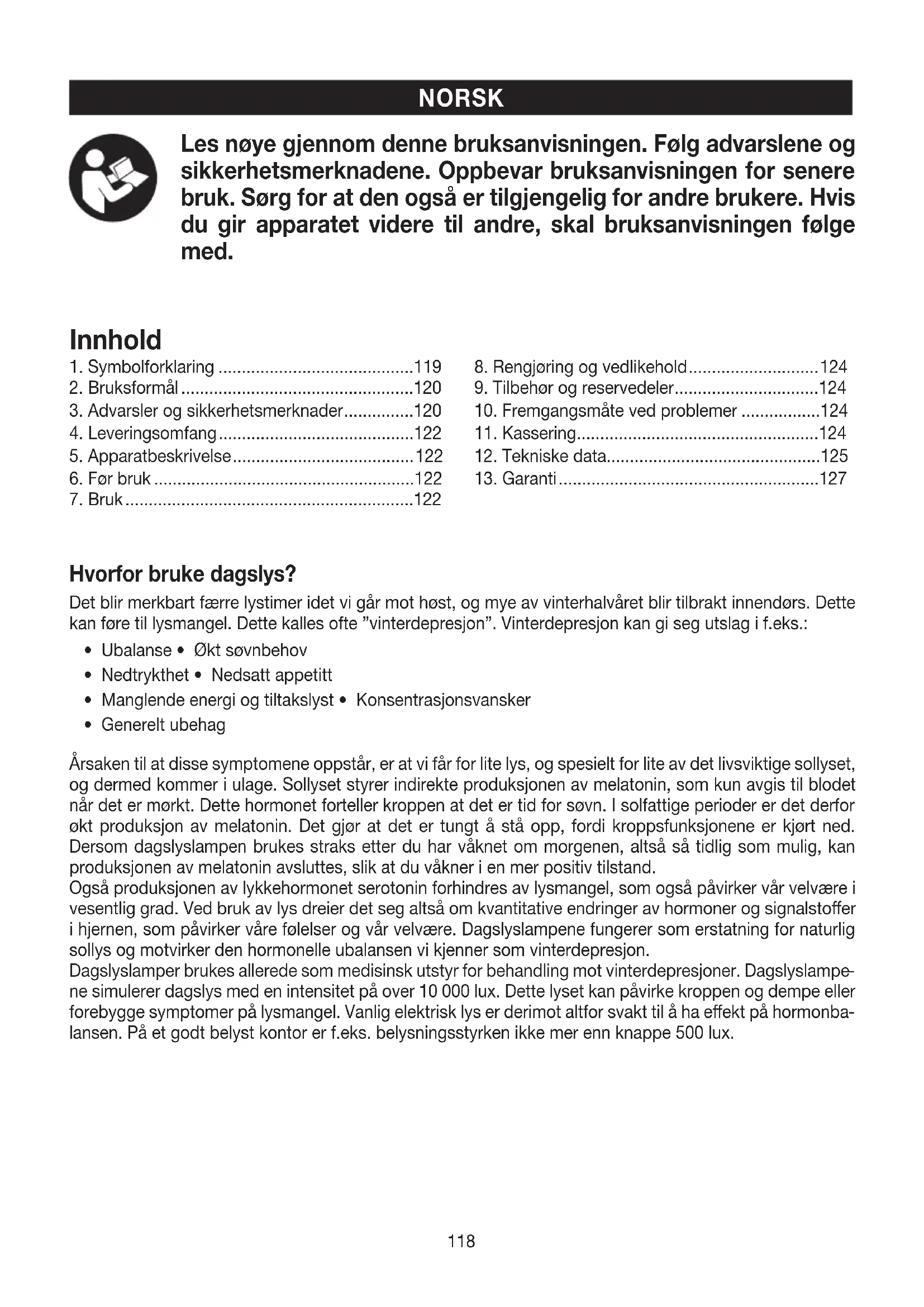 Bruksområde Dagslyslampen er beregnet på å kompensere for eekten av mangelen på dagslys, spesielt sollys, og for å lindre aektive forstyrrelser om vinteren, humørsvingninger og søvnforstyrrelser. Brukergruppe For voksne og barn fra 3 år. Målgruppe Det kreves ingen spesifikk kunnskap eller egnethet for å bruke apparatet. Pasienten kan bruke apparatet selv, med unntak av pasienter som trenger spesialstøtte. Indikasjoner Apparatet simulerer dagslys for å lindre sesong- eller stemningsrelaterte forstyrrelser.