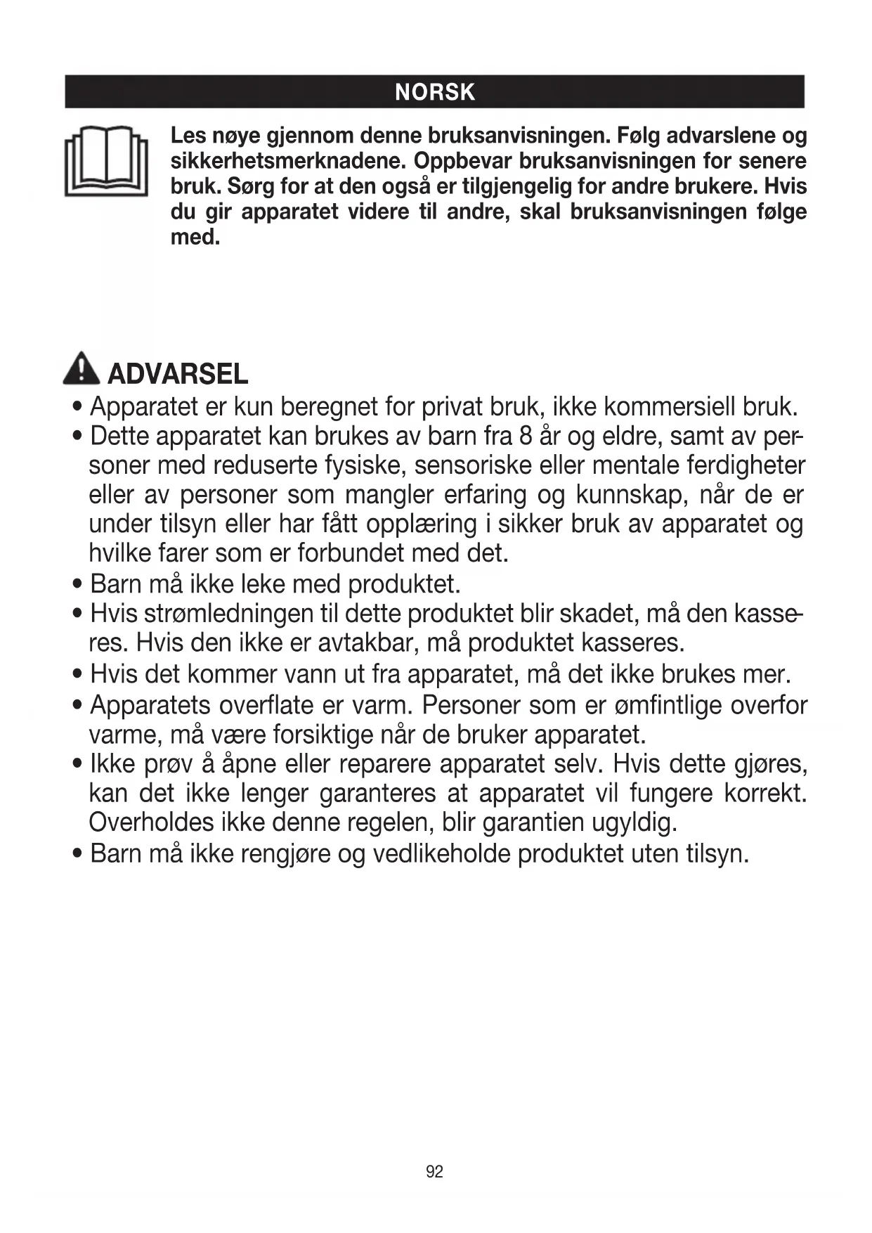 - Barn må ikke rengjøre og vedlikeholde produktet uten tilsyn.93