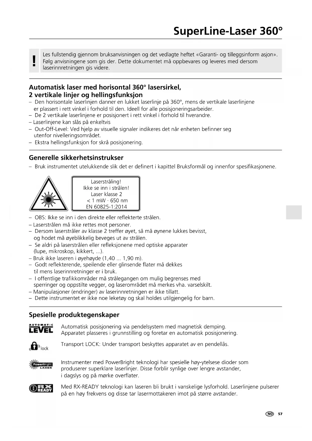 Generelle sikkerhetsinstrukser Laserstråling! Ikke se inn i strålen! Laser klasse 2 < 1 mW · 650 nm EN 60825-1:2014 – OBS: Ikke se inn i den direkte eller reekterte strålen. – Laserstrålen må ikke rettes mot personer. – Dersom laserstråler av klasse 2 treffer øyet, så må øynene lukkes bevisst, og hodet må øyeblikkelig beveges ut av strålen. – Se aldri på laserstrålen eller reeksjonene med optiske apparater (lupe, mikroskop, kikkert, ...). – Bruk ikke laseren i øyehøyde (1,40 ... 1,90 m). – Godt reekterende, speilende eller glinsende ater må dekkes til mens laserinnretninger er i bruk. – I offentlige trakkområder må strålegangen om mulig begrenses med sperringer og oppstilte vegger, og laserområdet må merkes vha. varselskilt. – Manipulasjoner (endringer) av laserinnretningen er ikke tillatt. – Dette instrumentet er ikke noe leketøy og skal holdes utilgjengelig for barn. – Bruk instrumentet utelukkende slik det er denert i kapittel Bruksformål og innenfor spesikasjonene. Spesielle produktegenskaper Automatisk posisjonering via pendelsystem med magnetisk demping. Apparatet plasseres i grunnstilling og foretar en automatisk posisjonering. Transport LOCK: Under transport beskyttes apparatet av en pendellås. Instrumenter med PowerBright teknologi har spesielle høy-ytelsese dioder som produserer superklare laserlinjer. Disse forblir synlige over lengre avstander, i dagslys og på mørke overflater. Med RX-READY teknologi kan laseren bli brukt i vanskelige lysforhold. Laserlinjene pulserer på en høy frekvens og disse tar lasermottakeren imot på større avstander.58 1H360° 2V S