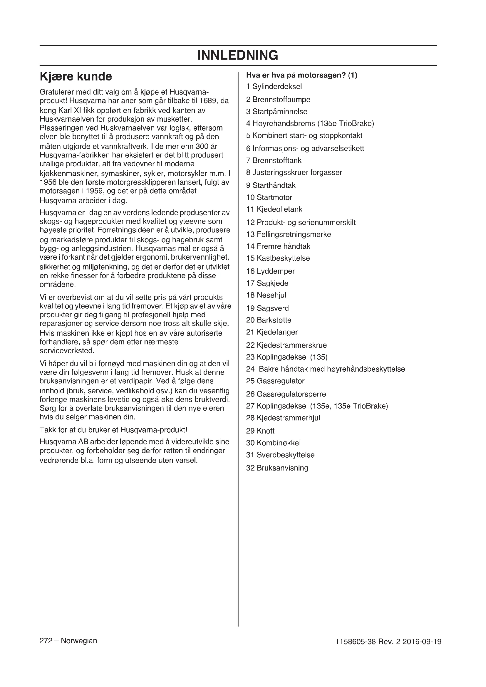 - EF-erklæring om samsvar INNLEDNING 272 – Norwegian 1158605-38 Rev. 2 2016-09-19 Kjære kunde Gratulerer med ditt valg om å kjøpe et Husqvarna- produkt! Husqvarna har aner som går tilbake til 1689, da kong Karl XI fikk oppført en fabrikk ved kanten av Huskvarnaelven for produksjon av musketter. Plasseringen ved Huskvarnaelven var logisk, ettersom elven ble benyttet til å produsere vannkraft og på den måten utgjorde et vannkraftverk. I de mer enn 300 år Husqvarna-fabrikken har eksistert er det blitt produsert utallige produkter, alt fra vedovner til moderne kjøkkenmaskiner, symaskiner, sykler, motorsykler m.m. I 1956 ble den første motorgressklipperen lansert, fulgt av motorsagen i 1959, og det er på dette området Husqvarna arbeider i dag. Husqvarna er i dag en av verdens ledende produsenter av skogs- og hageprodukter med kvalitet og yteevne som høyeste prioritet. Forretningsidéen er å utvikle, produsere og markedsføre produkter til skogs- og hagebruk samt bygg- og anleggsindustrien. Husqvarnas mål er også å være i forkant når det gjelder ergonomi, brukervennlighet, sikkerhet og miljøtenkning, og det er derfor det er utviklet en rekke finesser for å forbedre produktene på disse områdene. Vi er overbevist om at du vil sette pris på vårt produkts kvalitet og yteevne i lang tid fremover. Et kjøp av et av våre produkter gir deg tilgang til profesjonell hjelp med reparasjoner og service dersom noe tross alt skulle skje. Hvis maskinen ikke er kjøpt hos en av våre autoriserte forhandlere, så spør dem etter nærmeste serviceverksted. Vi håper du vil bli fornøyd med maskinen din og at den vil være din følgesvenn i lang tid fremover. Husk at denne bruksanvisningen er et verdipapir. Ved å følge dens innhold (bruk, service, vedlikehold osv.) kan du vesentlig forlenge maskinens levetid og også øke dens bruktverdi. Sørg for å overlate bruksanvisningen til den nye eieren hvis du selger maskinen din. Takk for at du bruker et Husqvarna-produkt! Husqvarna AB arbeider løpende med å videreutvikle sine produkter, og forbeholder seg derfor retten til endringer vedrørende bl.a. form og utseende uten varsel. Hva er hva på motorsagen? (1) 1 Sylinderdeksel 2 Brennstoffpumpe 3 Startpåminnelse 4 Høyrehåndsbrems (135e TrioBrake) 5 Kombinert start- og stoppkontakt 6 Informasjons- og advarselsetikett 7 Brennstofftank 8 Justeringsskruer forgasser 9 Starthåndtak 10 Startmotor 11 Kjedeoljetank 12 Produkt- og serienummerskilt 13 Fellingsretningsmerke 14 Fremre håndtak 15 Kastbeskyttelse 16 Lyddemper 17 Sagkjede 18 Nesehjul 19 Sagsverd 20 Barkstøtte 21 Kjedefanger 22 Kjedestrammerskrue 23 Koplingsdeksel (135) 24 Bakre håndtak med høyrehåndsbeskyttelse 25 Gassregulator 26 Gassregulatorsperre 27 Koplingsdeksel (135e, 135e TrioBrake) 28 Kjedestrammerhjul 29 Knott 30 Kombinøkkel 31 Sverdbeskyttelse 32 BruksanvisningGENERELLE SIKKERHETSINSTRUKSJONER Norwegian – 273 1158605-38 Rev. 2 2016-09-19 Tiltak før bruk av en ny motorsag p. 296