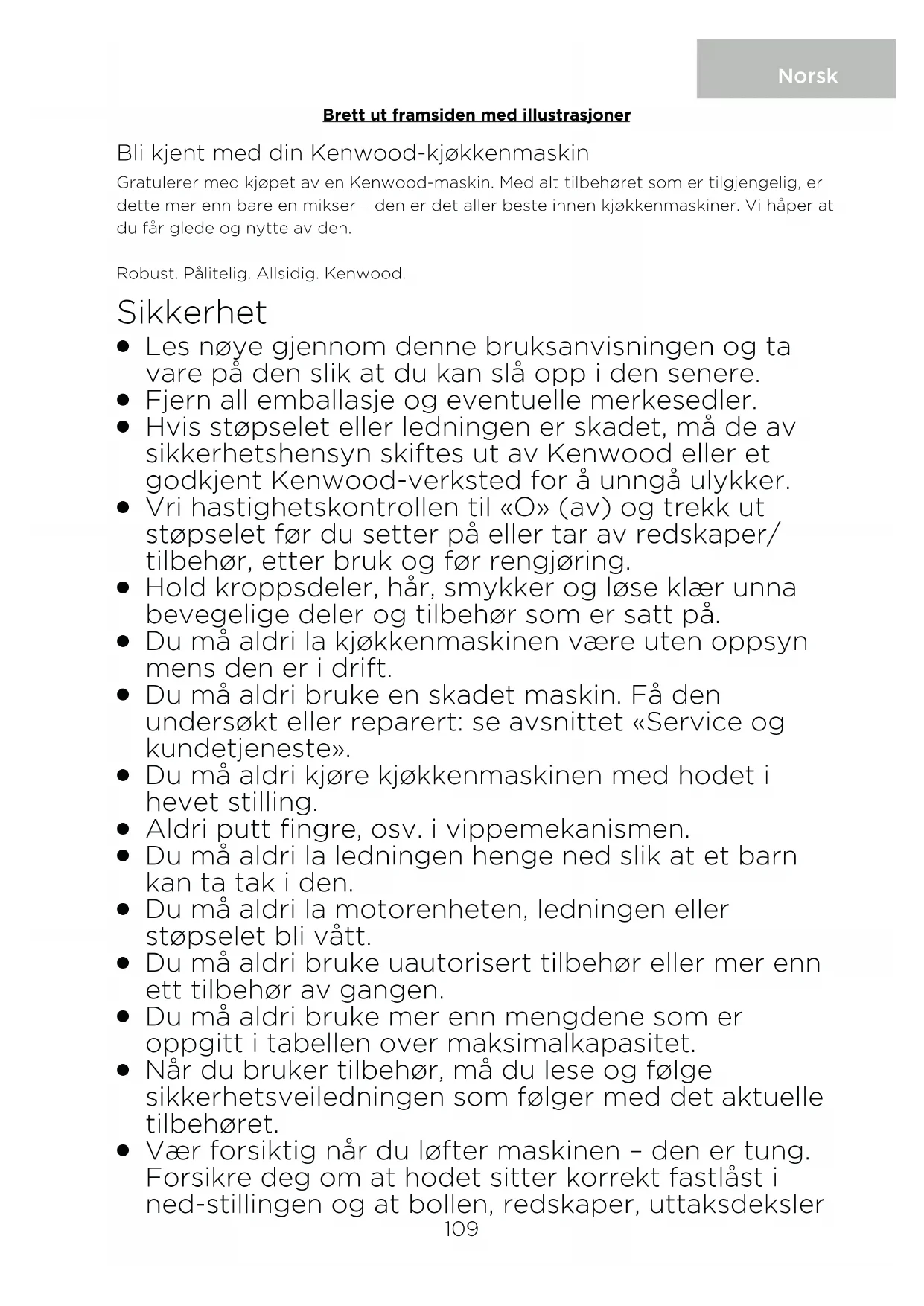 Bruk bare apparatet til dets tiltenkte hjemlige bruk. Kenwood frasier seg ethvert ansvar ved feilaktig bruk eller dersom apparatet ikke er brukt i henhold til denne bruksanvisningen. 110Før du setter i støpselet