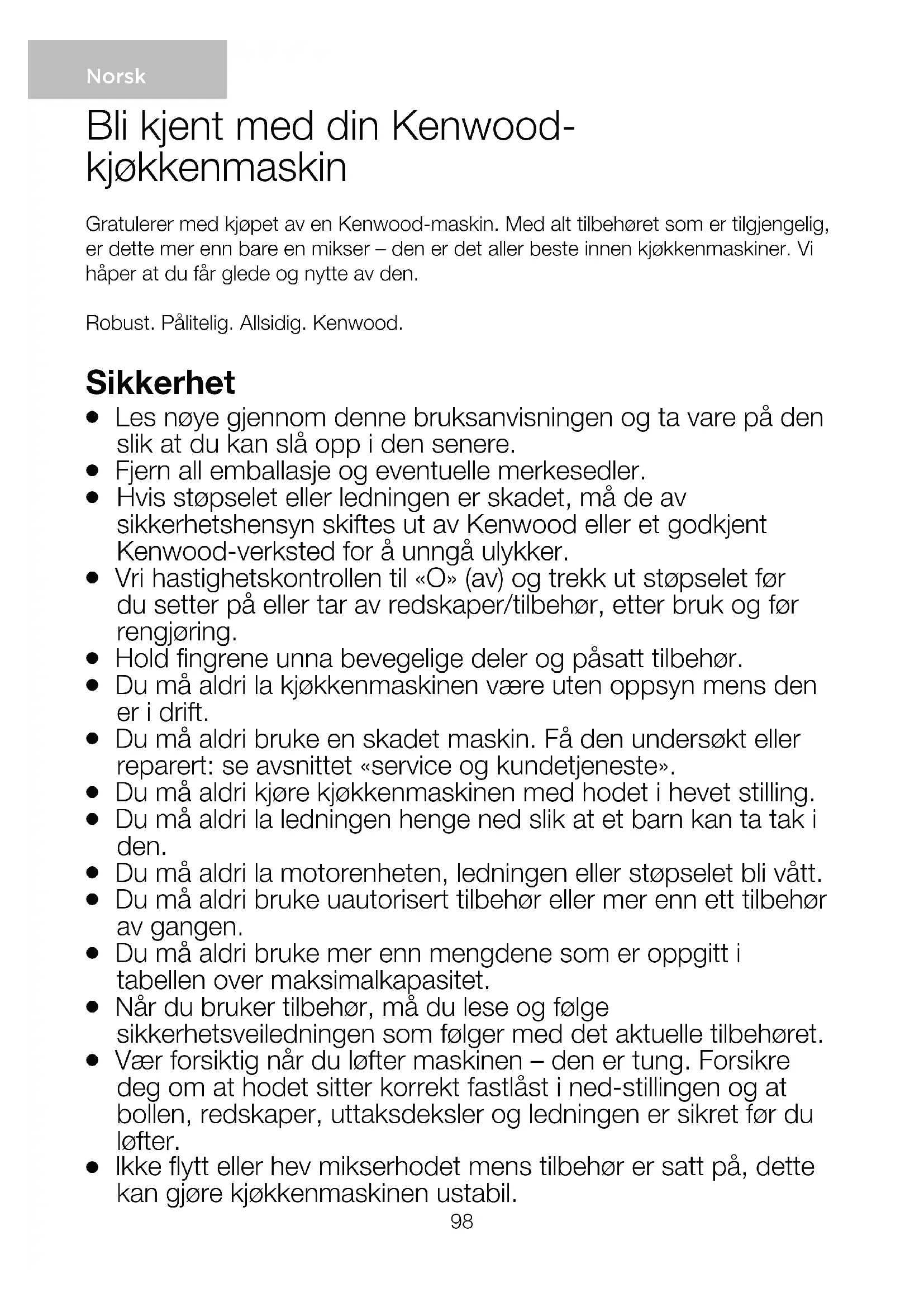 Bruk bare apparatet til dets tiltenkte hjemlige bruk. Kenwood frasier seg ethvert ansvar ved feilaktig bruk eller dersom apparatet ikke er brukt i henhold til denne bruksanvisningen. Før du setter inn støpselet