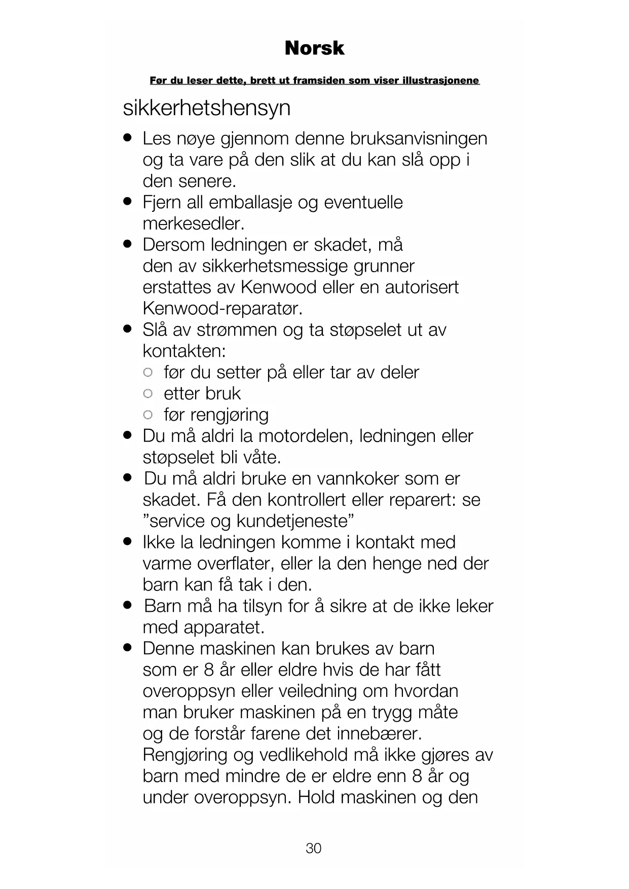 Denne maskinen kan brukes av barn som er 8 år eller eldre hvis de har fått overoppsyn eller veiledning om hvordan man bruker maskinen på en trygg måte og de forstår farene det innebærer. Rengjøring og vedlikehold må ikke gjøres av barn med mindre de er eldre enn 8 år og under overoppsyn. Hold maskinen og den Før du leser dette, brett ut framsiden som viser illustrasjonene Norsk31 tilhørende ledningen utenfor rekkevidden til barn som er under 8 år.