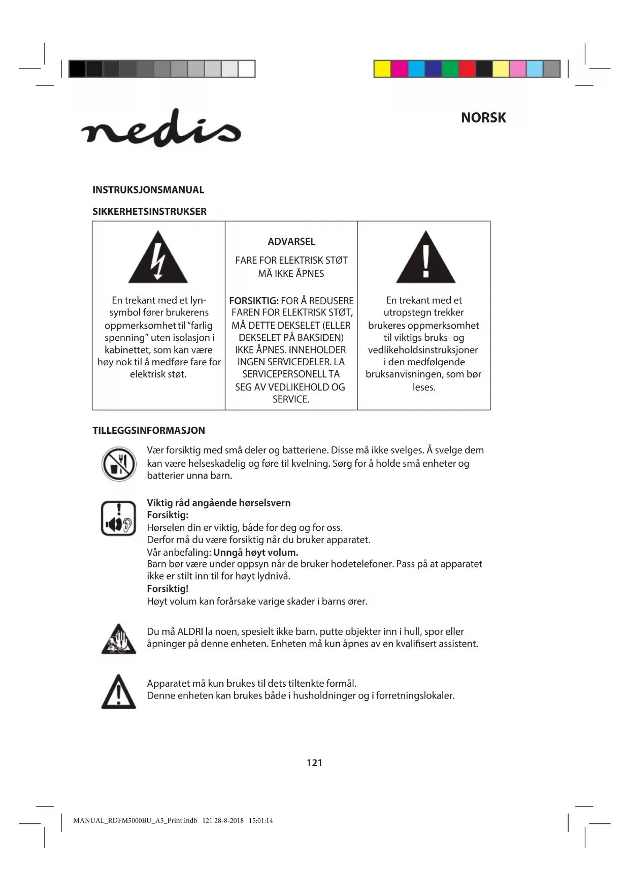 Sikkerhetsforhåndsregler: For å redusere faren for strømstøt, skal dette produktet BARE åpnes av en autorisert tekniker når vedlikehold er nødvendig. Koble produktet fra strømmen og annet utstyr dersom et problem oppstår. Ikke utsett produktet for vann eller fuktighet. Vedlikehold: Rens bare med en tørr klut. Ikke bruk rensemidler eller skuremidler. Garanti: Ingen garanti eller erstatningsansvar aksepteres ved endringer og modiseringer av produktet eller skade forårsaket av uriktig bruk av dette produktet. Generelt: Utforming og spesikasjoner kan endres uten forhåndsvarsel. Alle logoer, merker og produktnavn er varemerker eller registrerte varemerker til de respektive eierne, og skal behandles som dette. Behold denne veiledningen og innpakningen for fremtidig referanse. OBS: Dette produktet er markert med dette symbolet. Det betyr at brukte elektriske og elektroniske produkter ikke må blandes med vanlig husholdningsavfall. Det nnes egne innsamlingssystem for slike produkter. Dette produktet har blitt produsert og levert i henhold til alle relevante bestemmelser og direktiver, gyldig for alle medlemsstater i EU. Det overholder også alle gjeldende spesikasjoner og bestemmelser i landet det selges i. Formell dokumentasjon er tilgjengelig på forespørsel. Dette inkluderer, men begrenser seg ikke til: Samsvarserklæring (og produktidentitet) dataark for materialsikkerhet produkttestrapport. Vennligst kontakt kundeservice for hjelp: via nettstedet: http://www.nedis.com/en-us/contact/contact-form.htm via e-post: service@nedis.com via telefon: +31 (0)73-5993965 (i kontortiden) NEDIS B.V., De Tweeling 28, 5215 MC ’s-Hertogenbosch, THE NETHERLANDS MANUAL_RDFM5000BU_A5_Print.indb 128 28-8-2018 15:01:15129