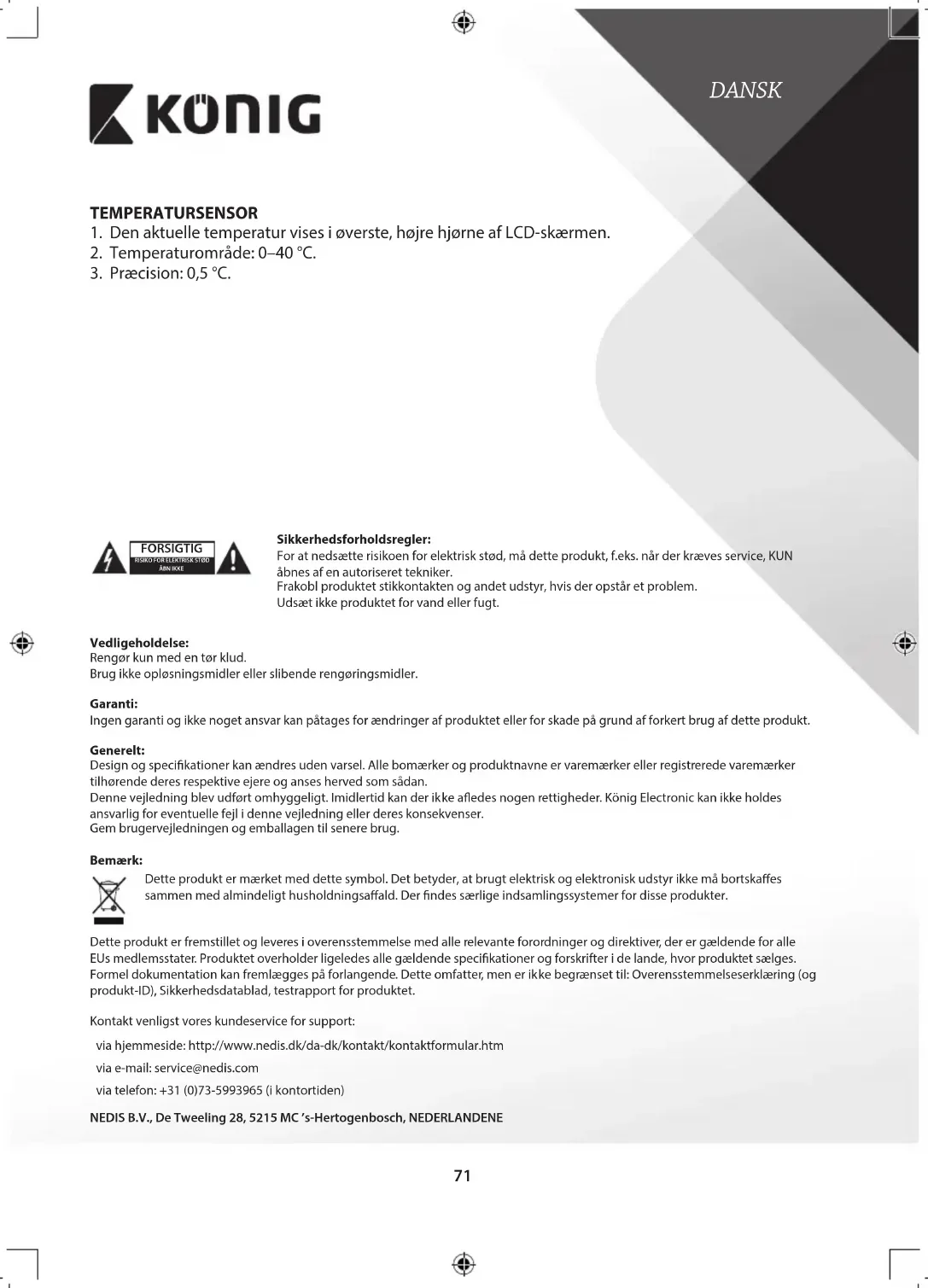 Sikkerhetsforhåndsregler: For å redusere faren for strømstøt, skal dette produktet BARE åpnes av en autorisert tekniker når vedlikehold er nødvendig. Koble produktet fra strømmen og annet utstyr dersom et problem oppstår. Ikke utsett produktet for vann eller fuktighet. Vedlikehold: Rens bare med en tørr klut. Ikke bruk rensemidler eller skuremidler. Garanti: Ingen garanti eller erstatningsansvar aksepteres ved endringer og modiseringer av produktet eller skade forårsaket av uriktig bruk av dette produktet. Generelt: Utforming og spesikasjoner kan endres uten forhåndsvarsel. Alle logoer, merker og produktnavn er varemerker eller registrerte varemerker til de respektive eierne, og skal behandles som dette. Denne bruksanvisningen ble laget med omhu. Imidlertid kan ingen rettigheter utledes. König Electronic kan ikke ta ansvar for eventuelle feil i denne manualen eller konsekvenser som følger. Behold denne veiledningen og innpakningen for fremtidig referanse. OBS: Dette produktet er markert med dette symbolet. Det betyr at brukte elektriske og elektroniske produkter ikke må blandes med vanlig husholdningsavfall. Det nnes egne innsamlingssystem for slike produkter. Dette produktet har blitt produsert og levert i henhold til alle relevante bestemmelser og direktiver, gyldig for alle medlemsstater i EU. Det overholder også alle gjeldende spesikasjoner og bestemmelser i landet det selges i. Formell dokumentasjon er tilgjengelig på forespørsel. Dette inkluderer, men begrenser seg ikke til: Samsvarserklæring (og produktidentitet) dataark for materialsikkerhet produkttestrapport. Vennligst kontakt kundeservice for hjelp: via nettstedet: http://www.nedis.com/en-us/contact/contact-form.htm via e-post: service@nedis.com via telefon: +31 (0)73-5993965 (i kontortiden) NEDIS B.V., De Tweeling 28, 5215 MC ’s-Hertogenbosch, THE NETHERLANDS77