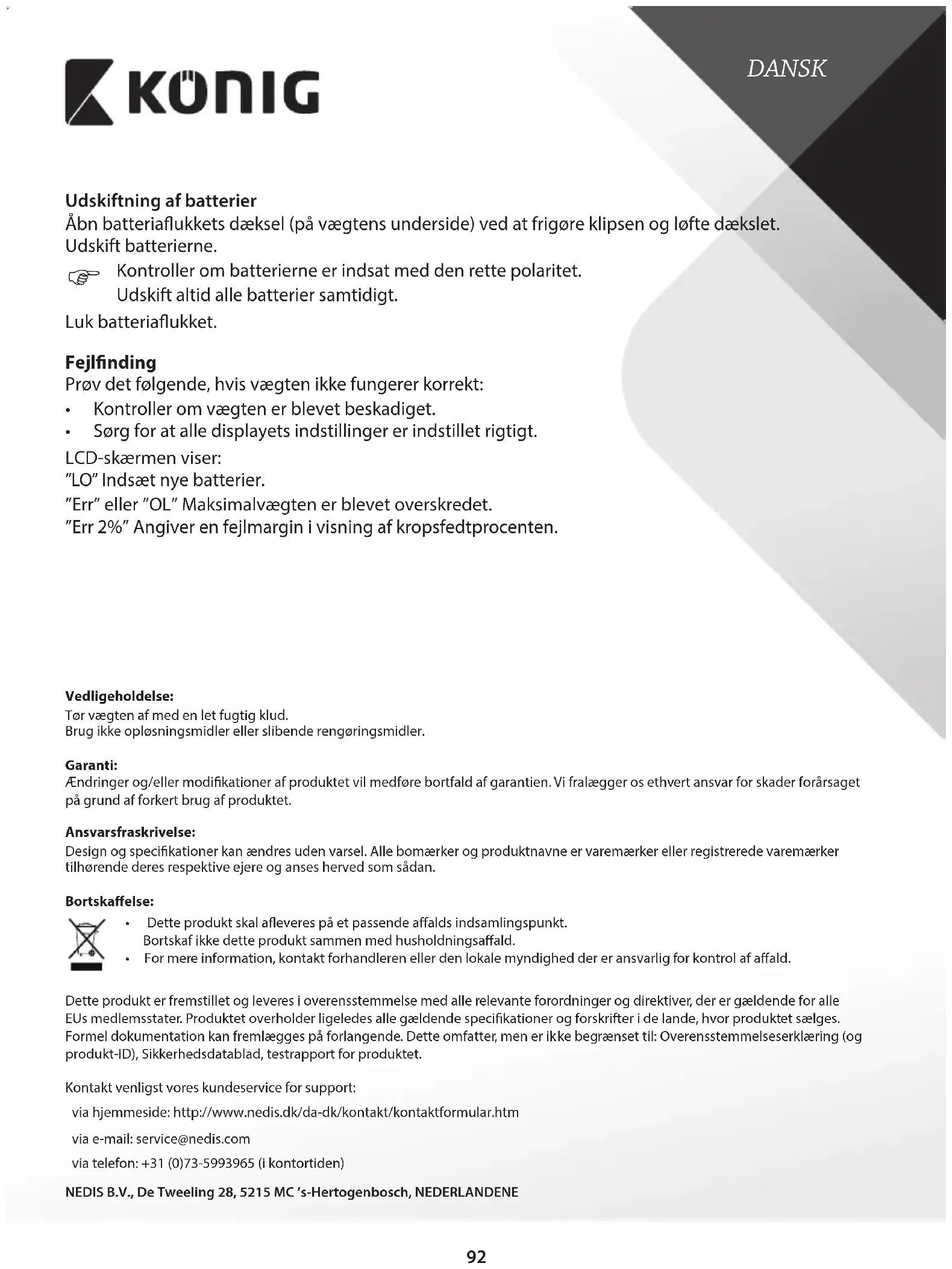 - Sjekk om alle skjerminnstillingene er korrekte. LCD-skjermvisninger: ”LO” Sett inn nye batterier. ”Err” of ”OL” Maksimalvekten er overskredet. ”Err 2%” Indikerer feilmarginen i kroppsfett-prosentandelen. Vedlikehold: Rengjør vekten med en lett fuktig klut. Ikke bruk rensemidler eller skuremidler. Garanti: Eventuelle endringer og/eller modikasjoner av produkter opphever garantien. Vi tar ikke ansvar for skade som forårsakes av ukorrekt bruk av dette produktet. Ansvarsfraskrivelse: Utforming og spesikasjoner kan endres uten forhåndsvarsel. Alle logoer, merker og produktnavn er varemerker eller registrerte varemerker til de respektive eierne, og skal behandles som dette. Avhending: