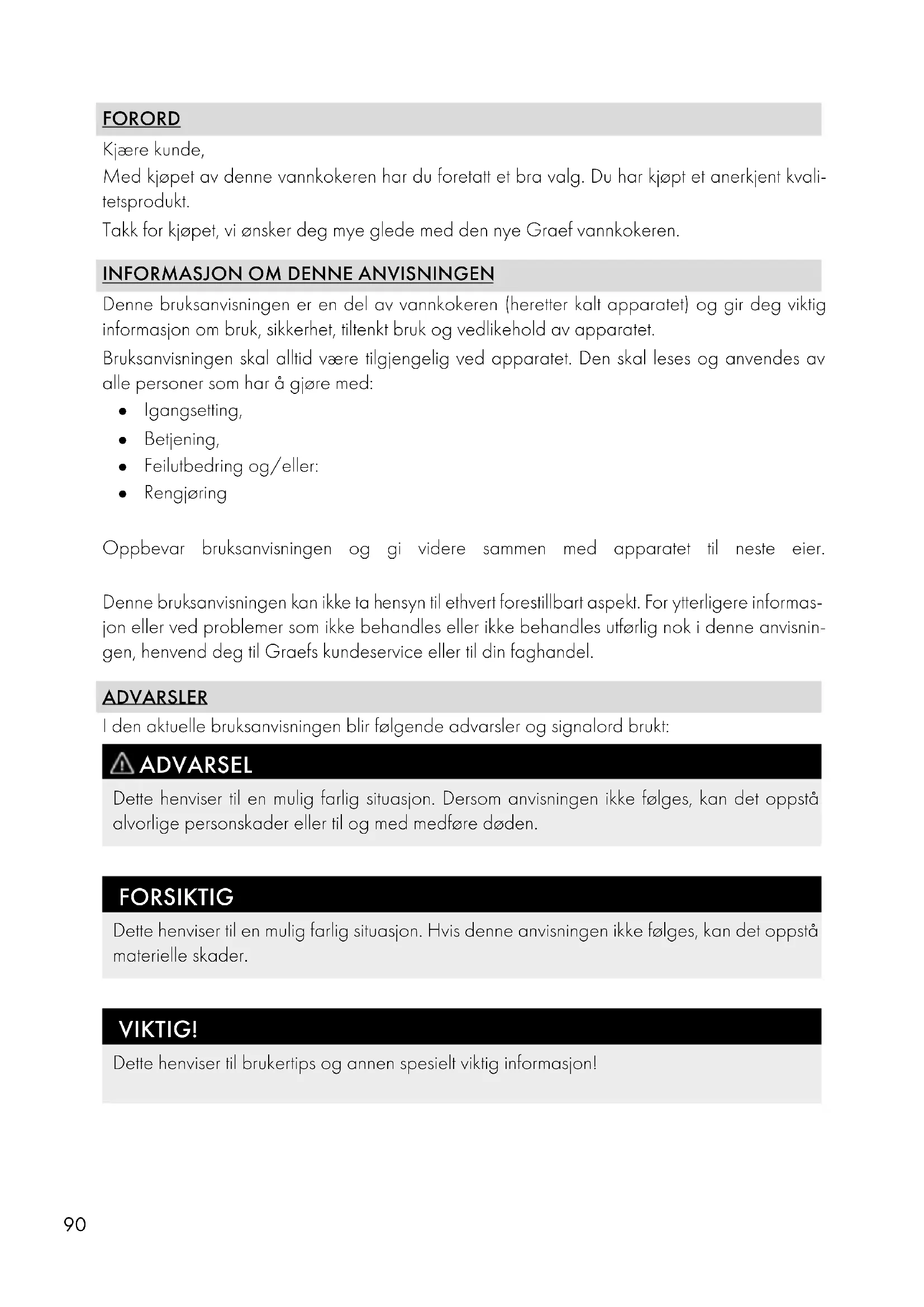 Denne bruksanvisningen er en del av vannkokeren (heretter kalt apparatet) og gir deg viktig informasjon om bruk, sikkerhet, tiltenkt bruk og vedlikehold av apparatet. Bruksanvisningen skal alltid være tilgjengelig ved apparatet. Den skal leses og anvendes av alle personer som har å gjøre med: ● Igangsetting, ● Betjening, ● Feilutbedring og/eller: ● Rengjøring Oppbevar bruksanvisningen og gi videre sammen med apparatet til neste eier. Denne bruksanvisningen kan ikke ta hensyn til ethvert forestillbart aspekt. For ytterligere informas- jon eller ved problemer som ikke behandles eller ikke behandles utførlig nok i denne anvisnin- gen, henvend deg til Graefs kundeservice eller til din faghandel. ADVARSLER I den aktuelle bruksanvisningen blir følgende advarsler og signalord brukt: ADVARSEL Dette henviser til en mulig farlig situasjon. Dersom anvisningen ikke følges, kan det oppstå alvorlige personskader eller til og med medføre døden. FORSIKTIG Dette henviser til en mulig farlig situasjon. Hvis denne anvisningen ikke følges, kan det oppstå materielle skader. VIKTIG! Dette henviser til brukertips og annen spesielt viktig informasjon!91