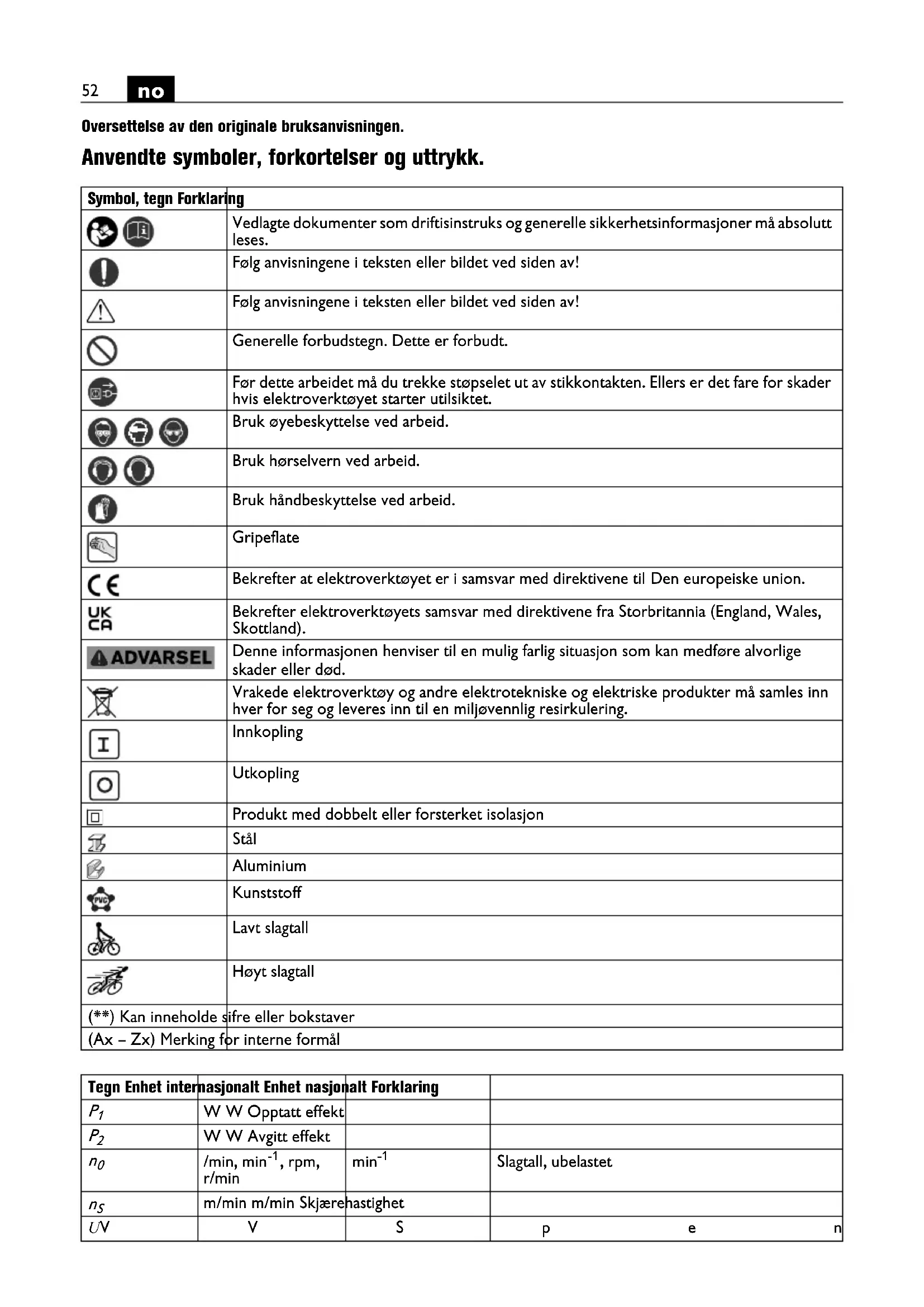 Oversettelse av den originale bruksanvisningen. Anvendte symboler, forkortelser og uttrykk. Symbol, tegn Forklaring Vedlagte dokumenter som driftisinstruks og generelle sikkerhetsinformasjoner må absolutt leses. Følg anvisningene i teksten eller bildet ved siden av! Følg anvisningene i teksten eller bildet ved siden av! Generelle forbudstegn. Dette er forbudt. Før dette arbeidet må du trekke støpselet ut av stikkontakten. Ellers er det fare for skader hvis elektroverktøyet starter utilsiktet. Bruk øyebeskyttelse ved arbeid. Bruk hørselvern ved arbeid. Bruk håndbeskyttelse ved arbeid. Gripeflate Bekrefter at elektroverktøyet er i samsvar med direktivene til Den europeiske union. Bekrefter elektroverktøyets samsvar med direktivene fra Storbritannia (England, Wales, Skottland). Denne informasjonen henviser til en mulig farlig situasjon som kan medføre alvorlige skader eller død. Vrakede elektroverktøy og andre elektrotekniske og elektriske produkter må samles inn hver for seg og leveres inn til en miljøvennlig resirkulering. Innkopling Utkopling Produkt med dobbelt eller forsterket isolasjon Stål Aluminium Kunststoff Lavt slagtall Høyt slagtall (**) Kan inneholde sifre eller bokstaver (Ax – Zx) Merking for interne formål Tegn Enhet internasjonalt Enhet nasjonalt Forklaring