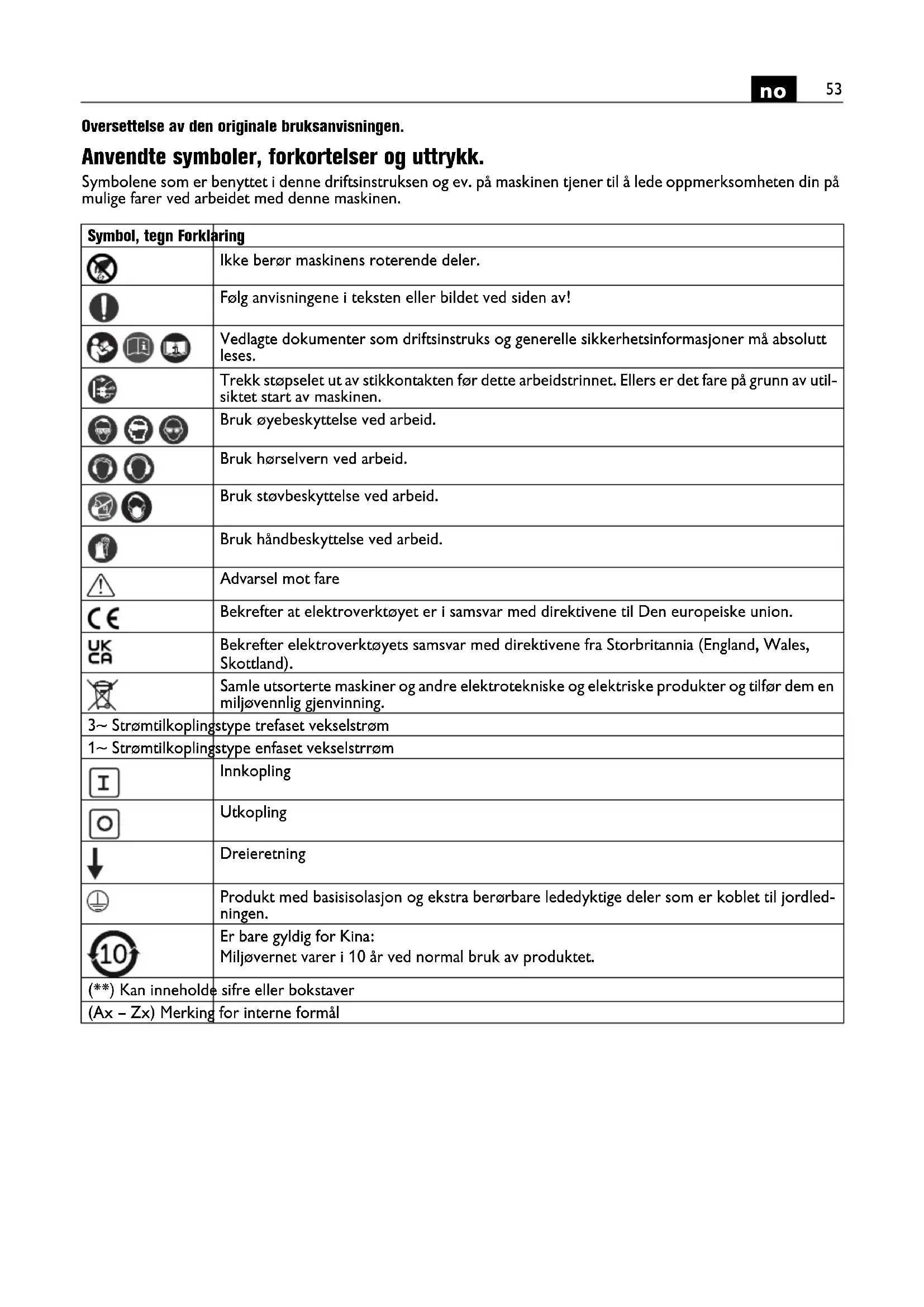Oversettelse av den originale bruksanvisningen. Anvendte symboler, forkortelser og uttrykk. Symbolene som er benyttet i denne driftsinstruksen og ev. på maskinen tjener til å lede oppmerksomheten din på mulige farer ved arbeidet med denne maskinen. Symbol, tegn Forklaring Ikke berør maskinens roterende deler. Følg anvisningene i teksten eller bildet ved siden av! Vedlagte dokumenter som driftsinstruks og generelle sikkerhetsinformasjoner må absolutt leses. Trekk støpselet ut av stikkontakten før dette arbeidstrinnet. Ellers er det fare på grunn av util- siktet start av maskinen. Bruk øyebeskyttelse ved arbeid. Bruk hørselvern ved arbeid. Bruk støvbeskyttelse ved arbeid. Bruk håndbeskyttelse ved arbeid. Advarsel mot fare Bekrefter at elektroverktøyet er i samsvar med direktivene til Den europeiske union. Bekrefter elektroverktøyets samsvar med direktivene fra Storbritannia (England, Wales, Skottland). Samle utsorterte maskiner og andre elektrotekniske og elektriske produkter og tilfør dem en miljøvennlig gjenvinning. 3~ Strømtilkoplingstype trefaset vekselstrøm 1~ Strømtilkoplingstype enfaset vekselstrrøm Innkopling Utkopling Dreieretning Produkt med basisisolasjon og ekstra berørbare lededyktige deler som er koblet til jordled- ningen. Er bare gyldig for Kina: Miljøvernet varer i 10 år ved normal bruk av produktet. (**) Kan inneholde sifre eller bokstaver (Ax – Zx) Merking for interne formål54