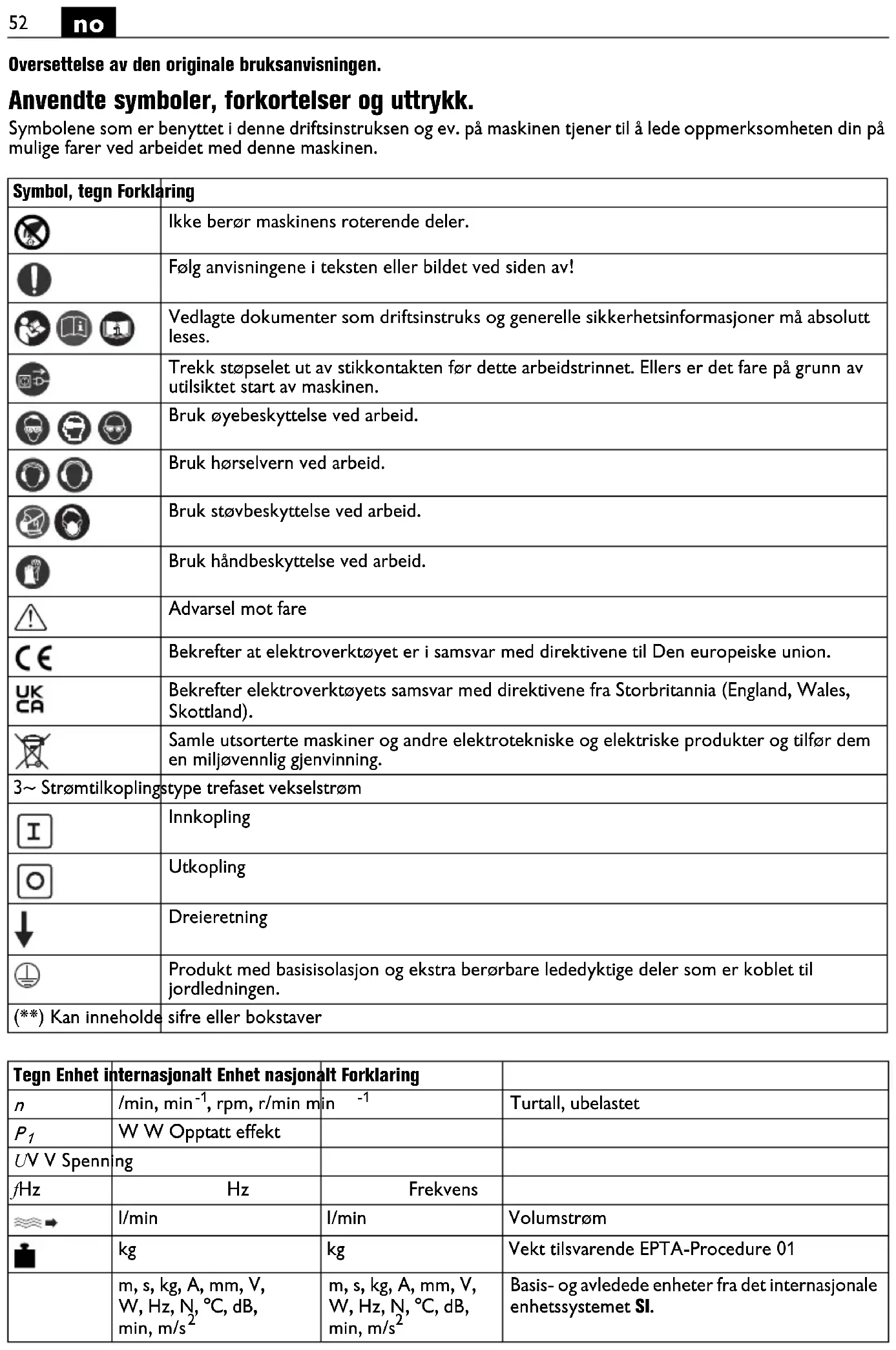 Oversettelse av den originale bruksanvisningen. Anvendte symboler, forkortelser og uttrykk. Symbolene som er benyttet i denne driftsinstruksen og ev. på maskinen tjener til å lede oppmerksomheten din på mulige farer ved arbeidet med denne maskinen. Symbol, tegn Forklaring Ikke berør maskinens roterende deler. Følg anvisningene i teksten eller bildet ved siden av! Vedlagte dokumenter som driftsinstruks og generelle sikkerhetsinformasjoner må absolutt leses. Trekk støpselet ut av stikkontakten før dette arbeidstrinnet. Ellers er det fare på grunn av utilsiktet start av maskinen. Bruk øyebeskyttelse ved arbeid. Bruk hørselvern ved arbeid. Bruk støvbeskyttelse ved arbeid. Bruk håndbeskyttelse ved arbeid. Advarsel mot fare Bekrefter at elektroverktøyet er i samsvar med direktivene til Den europeiske union. Bekrefter elektroverktøyets samsvar med direktivene fra Storbritannia (England, Wales, Skottland). Samle utsorterte maskiner og andre elektrotekniske og elektriske produkter og tilfør dem en miljøvennlig gjenvinning. 3~ Strømtilkoplingstype trefaset vekselstrøm Innkopling Utkopling Dreieretning Produkt med basisisolasjon og ekstra berørbare lededyktige deler som er koblet til jordledningen. (**) Kan inneholde sifre eller bokstaver Tegn Enhet internasjonalt Enhet nasjonalt Forklaring