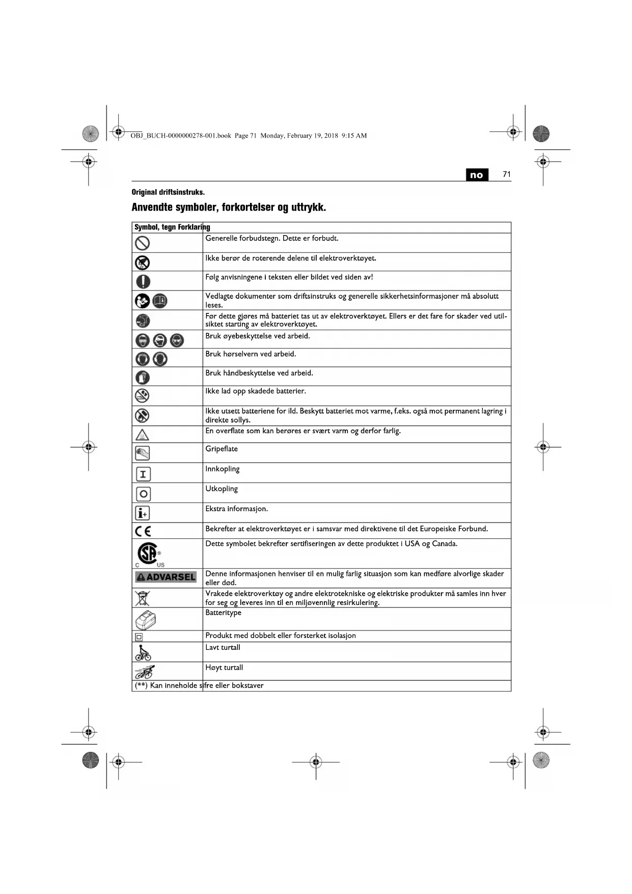Original driftsinstruks. Anvendte symboler, forkortelser og uttrykk. Symbol, tegn Forklaring Generelle forbudstegn. Dette er forbudt. Ikke berør de roterende delene til elektroverktøyet. Følg anvisningene i teksten eller bildet ved siden av! Vedlagte dokumenter som driftsinstruks og generelle sikkerhetsinformasjoner må absolutt leses. Før dette gjøres må batteriet tas ut av elektroverktøyet. Ellers er det fare for skader ved util- siktet starting av elektroverktøyet. Bruk øyebeskyttelse ved arbeid. Bruk hørselvern ved arbeid. Bruk håndbeskyttelse ved arbeid. Ikke lad opp skadede batterier. Ikke utsett batteriene for ild. Beskytt batteriet mot varme, f.eks. også mot permanent lagring i direkte sollys. En overflate som kan berøres er svært varm og derfor farlig. Gripeflate Innkopling Utkopling Ekstra informasjon. Bekrefter at elektroverktøyet er i samsvar med direktivene til det Europeiske Forbund. Dette symbolet bekrefter sertifiseringen av dette produktet i USA og Canada. Denne informasjonen henviser til en mulig farlig situasjon som kan medføre alvorlige skader eller død. Vrakede elektroverktøy og andre elektrotekniske og elektriske produkter må samles inn hver for seg og leveres inn til en miljøvennlig resirkulering. Batteritype Produkt med dobbelt eller forsterket isolasjon Lavt turtall Høyt turtall (**) Kan inneholde sifre eller bokstaver OBJ_BUCH-0000000278-001.book Page 71 Monday, February 19, 2018 9:15 AM72