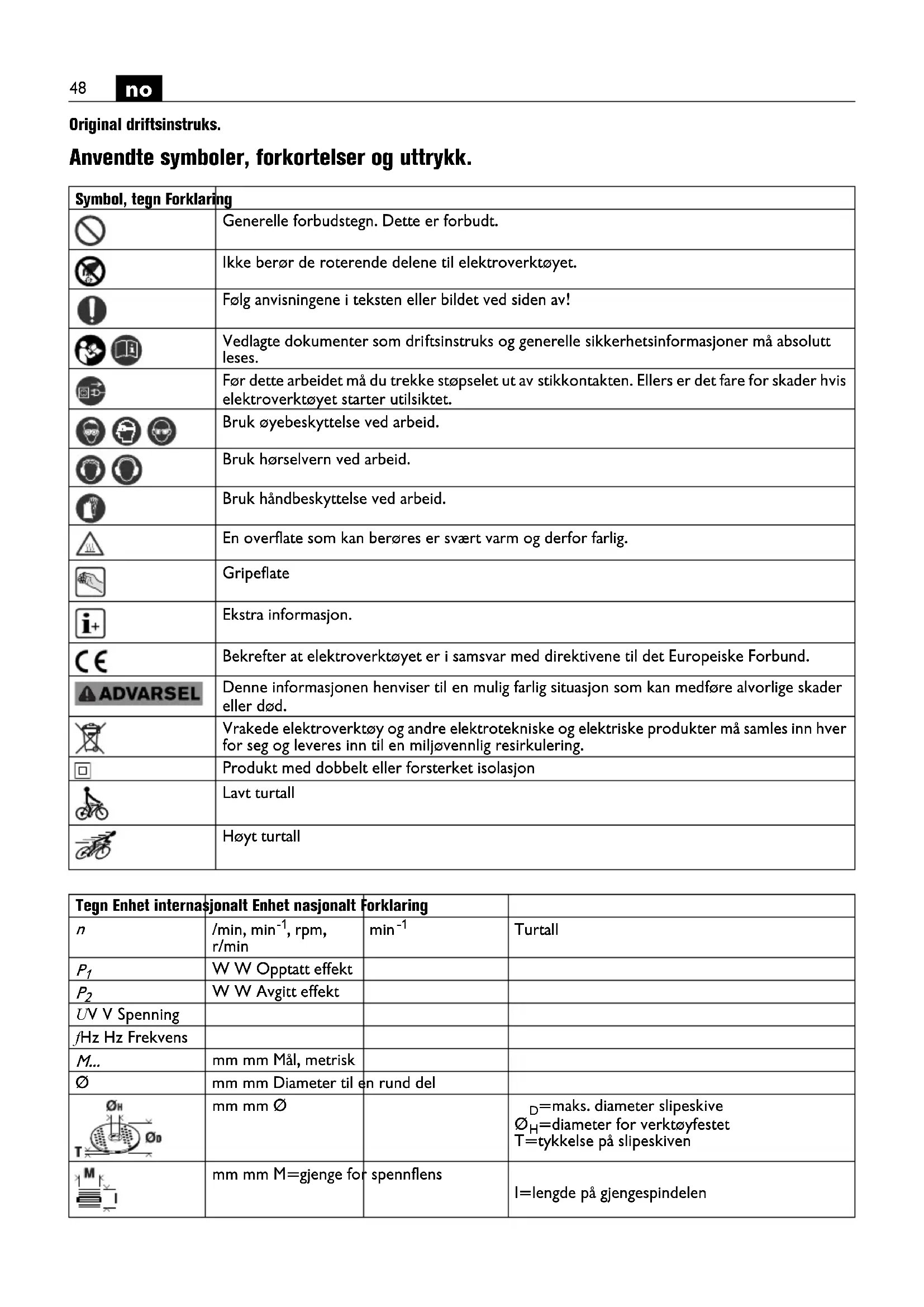Original driftsinstruks. Anvendte symboler, forkortelser og uttrykk. Symbol, tegn Forklaring Generelle forbudstegn. Dette er forbudt. Ikke berør de roterende delene til elektroverktøyet. Følg anvisningene i teksten eller bildet ved siden av! Vedlagte dokumenter som driftsinstruks og generelle sikkerhetsinformasjoner må absolutt leses. Før dette arbeidet må du trekke støpselet ut av stikkontakten. Ellers er det fare for skader hvis elektroverktøyet starter utilsiktet. Bruk øyebeskyttelse ved arbeid. Bruk hørselvern ved arbeid. Bruk håndbeskyttelse ved arbeid. En overflate som kan berøres er svært varm og derfor farlig. Gripeflate Ekstra informasjon. Bekrefter at elektroverktøyet er i samsvar med direktivene til det Europeiske Forbund. Denne informasjonen henviser til en mulig farlig situasjon som kan medføre alvorlige skader eller død. Vrakede elektroverktøy og andre elektrotekniske og elektriske produkter må samles inn hver for seg og leveres inn til en miljøvennlig resirkulering. Produkt med dobbelt eller forsterket isolasjon Lavt turtall Høyt turtall Tegn Enhet internasjonalt Enhet nasjonalt Forklaring