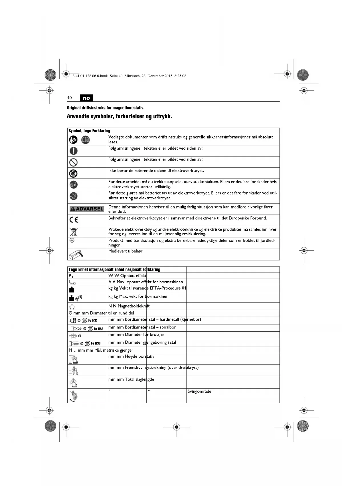 Original driftsinstruks for magnetborestativ. Anvendte symboler, forkortelser og uttrykk. Symbol, tegn Forklaring Vedlagte dokumenter som driftsinstruks og generelle sikkerhetsinformasjoner må absolutt leses. Følg anvisningene i teksten eller bildet ved siden av! Følg anvisningene i teksten eller bildet ved siden av! Ikke berør de roterende delene til elektroverktøyet. Før dette arbeidet må du trekke støpselet ut av stikkontakten. Ellers er det fare for skader hvis elektroverktøyet starter uvilkårlig. Før dette gjøres må batteriet tas ut av elektroverktøyet. Ellers er det fare for skader ved util- siktet starting av elektroverktøyet. Denne informasjonen henviser til en mulig farlig situasjon som kan medføre alvorlige farer eller død. Bekrefter at elektroverktøyet er i samsvar med direktivene til det Europeiske Forbund. Vrakede elektroverktøy og andre elektrotekniske og elektriske produkter må samles inn hver for seg og leveres inn til en miljøvennlig resirkulering. Produkt med basisisolasjon og ekstra berørbare lededyktige deler som er koblet til jordled- ningen. Medlevert tilbehør Tegn Enhet internasjonalt Enhet nasjonalt Forklaring