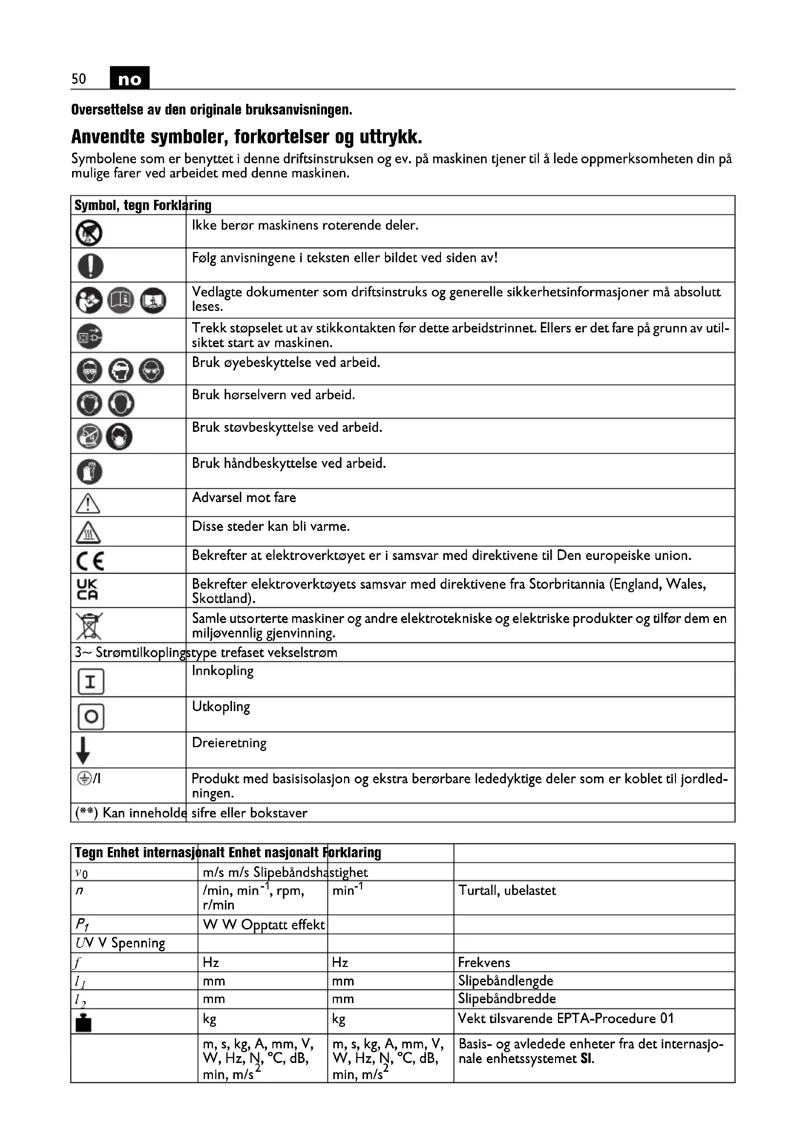 Oversettelse av den originale bruksanvisningen. Anvendte symboler, forkortelser og uttrykk. Symbolene som er benyttet i denne driftsinstruksen og ev. på maskinen tjener til å lede oppmerksomheten din på mulige farer ved arbeidet med denne maskinen. Symbol, tegn Forklaring Ikke berør maskinens roterende deler. Følg anvisningene i teksten eller bildet ved siden av! Vedlagte dokumenter som driftsinstruks og generelle sikkerhetsinformasjoner må absolutt leses. Trekk støpselet ut av stikkontakten før dette arbeidstrinnet. Ellers er det fare på grunn av util- siktet start av maskinen. Bruk øyebeskyttelse ved arbeid. Bruk hørselvern ved arbeid. Bruk støvbeskyttelse ved arbeid. Bruk håndbeskyttelse ved arbeid. Advarsel mot fare Disse steder kan bli varme. Bekrefter at elektroverktøyet er i samsvar med direktivene til Den europeiske union. Bekrefter elektroverktøyets samsvar med direktivene fra Storbritannia (England, Wales, Skottland). Samle utsorterte maskiner og andre elektrotekniske og elektriske produkter og tilfør dem en miljøvennlig gjenvinning. 3~ Strømtilkoplingstype trefaset vekselstrøm Innkopling Utkopling Dreieretning /I Produkt med basisisolasjon og ekstra berørbare lededyktige deler som er koblet til jordled- ningen. (**) Kan inneholde sifre eller bokstaver Tegn Enhet internasjonalt Enhet nasjonalt Forklaring