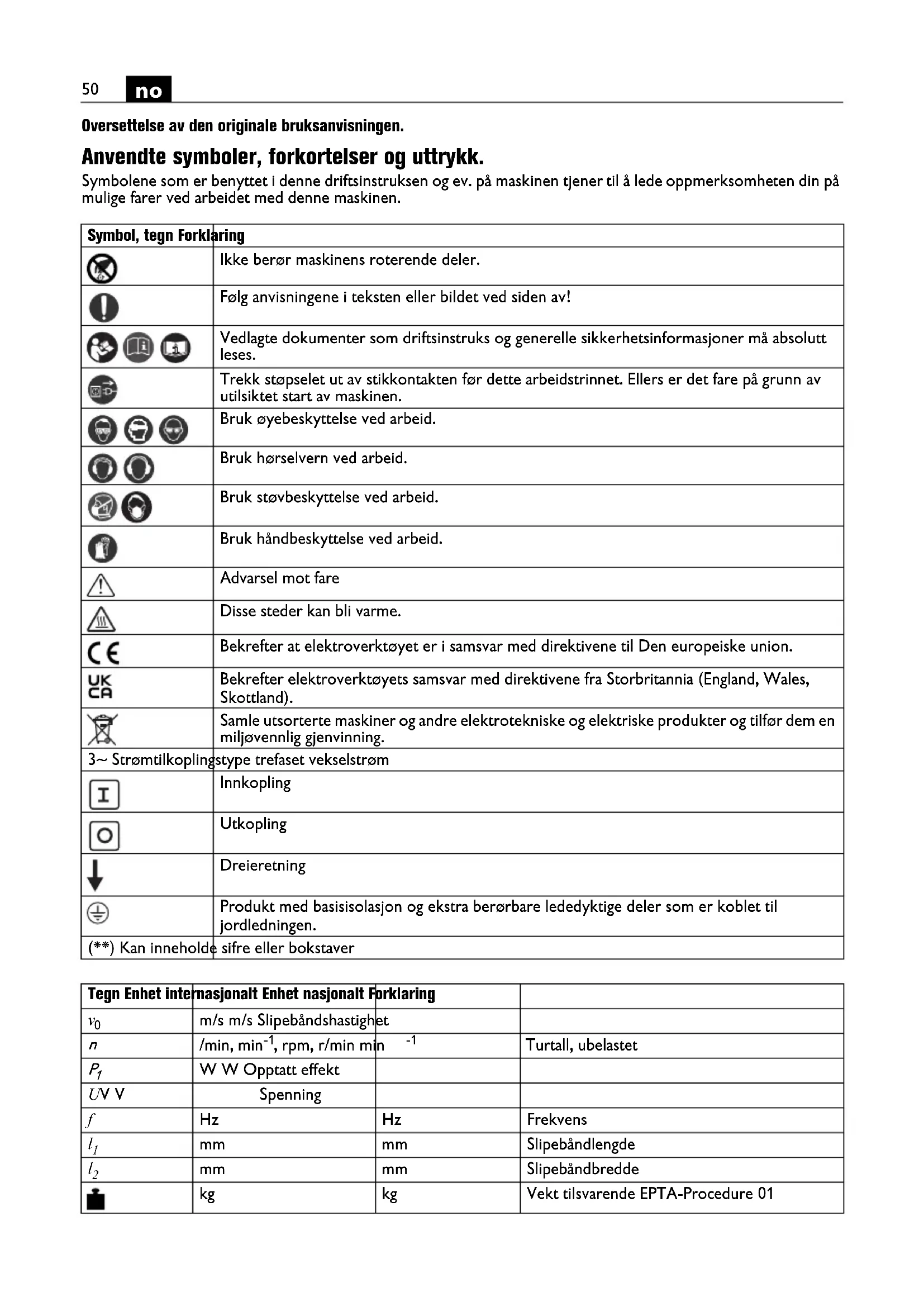 Oversettelse av den originale bruksanvisningen. Anvendte symboler, forkortelser og uttrykk. Symbolene som er benyttet i denne driftsinstruksen og ev. på maskinen tjener til å lede oppmerksomheten din på mulige farer ved arbeidet med denne maskinen. Symbol, tegn Forklaring Ikke berør maskinens roterende deler. Følg anvisningene i teksten eller bildet ved siden av! Vedlagte dokumenter som driftsinstruks og generelle sikkerhetsinformasjoner må absolutt leses. Trekk støpselet ut av stikkontakten før dette arbeidstrinnet. Ellers er det fare på grunn av utilsiktet start av maskinen. Bruk øyebeskyttelse ved arbeid. Bruk hørselvern ved arbeid. Bruk støvbeskyttelse ved arbeid. Bruk håndbeskyttelse ved arbeid. Advarsel mot fare Disse steder kan bli varme. Bekrefter at elektroverktøyet er i samsvar med direktivene til Den europeiske union. Bekrefter elektroverktøyets samsvar med direktivene fra Storbritannia (England, Wales, Skottland). Samle utsorterte maskiner og andre elektrotekniske og elektriske produkter og tilfør dem en miljøvennlig gjenvinning. 3~ Strømtilkoplingstype trefaset vekselstrøm Innkopling Utkopling Dreieretning Produkt med basisisolasjon og ekstra berørbare lededyktige deler som er koblet til jordledningen. (**) Kan inneholde sifre eller bokstaver Tegn Enhet internasjonalt Enhet nasjonalt Forklaring