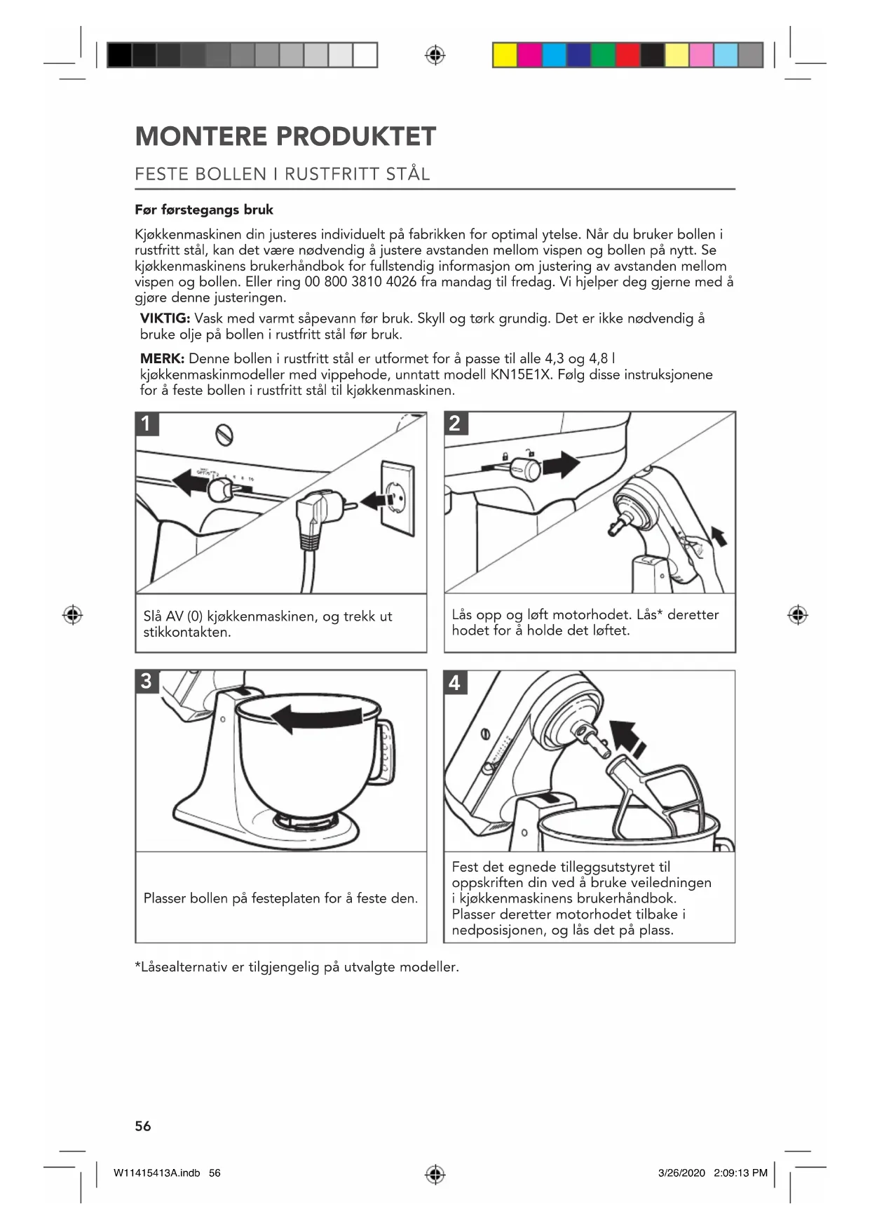 Før førstegangs bruk Kjøkkenmaskinen din justeres individuelt på fabrikken for optimal ytelse. Når du bruker bollen i rustfritt stål, kan det være nødvendig å justere avstanden mellom vispen og bollen på nytt. Se kjøkkenmaskinens brukerhåndbok for fullstendig informasjon om justering av avstanden mellom vispen og bollen. Eller ring 00 800 3810 4026 fra mandag til fredag. Vi hjelper deg gjerne med å gjøre denne justeringen. VIKTIG: Vask med varmt såpevann før bruk. Skyll og tørk grundig. Det er ikke nødvendig å bruke olje på bollen i rustfritt stål før bruk. MERK: Denne bollen i rustfritt stål er utformet for å passe til alle 4,3 og 4,8l kjøkkenmaskinmodeller med vippehode, unntatt modell KN15E1X. Følg disse instruksjonene for å feste bollen i rustfritt stål til kjøkkenmaskinen. Slå AV (0) kjøkkenmaskinen, og trekk ut stikkontakten.