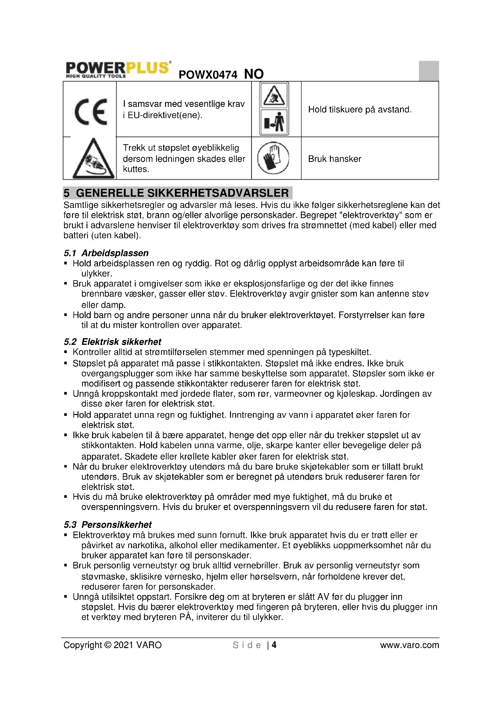 - Unngå utilsiktet oppstart. Forsikre deg om at bryteren er slått AV før du plugger inn støpslet. Hvis du bærer elektroverktøy med fingeren på bryteren, eller hvis du plugger inn et verktøy med bryteren PÅ, inviterer du til ulykker.POWX0474 NO Copyright © 2021 VARO S i d e | 5 www.varo.com