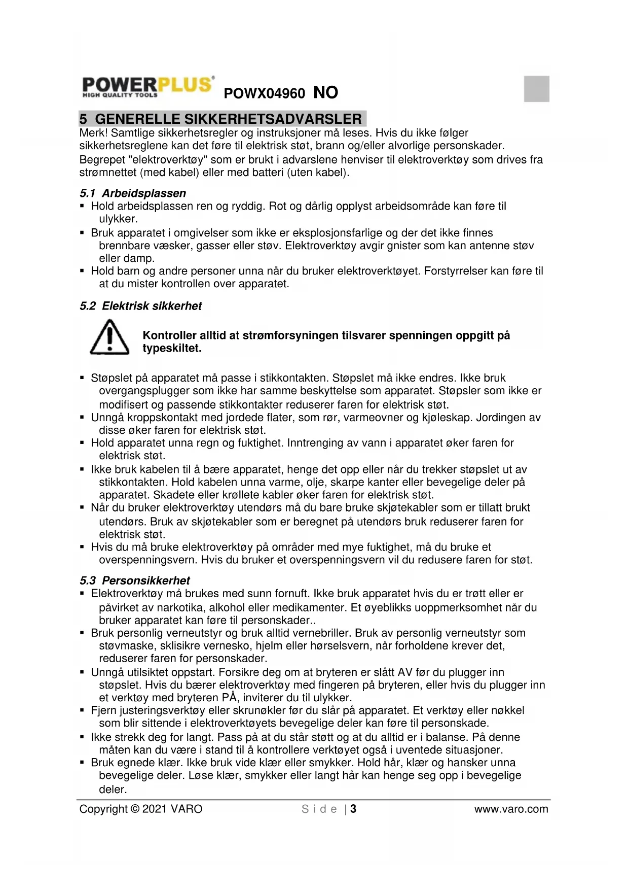 - Bruk egnede klær. Ikke bruk vide klær eller smykker. Hold hår, klær og hansker unna bevegelige deler. Løse klær, smykker eller langt hår kan henge seg opp i bevegelige deler.POWX04960 NO Copyright © 2021 VARO S i d e | 4 www.varo.com