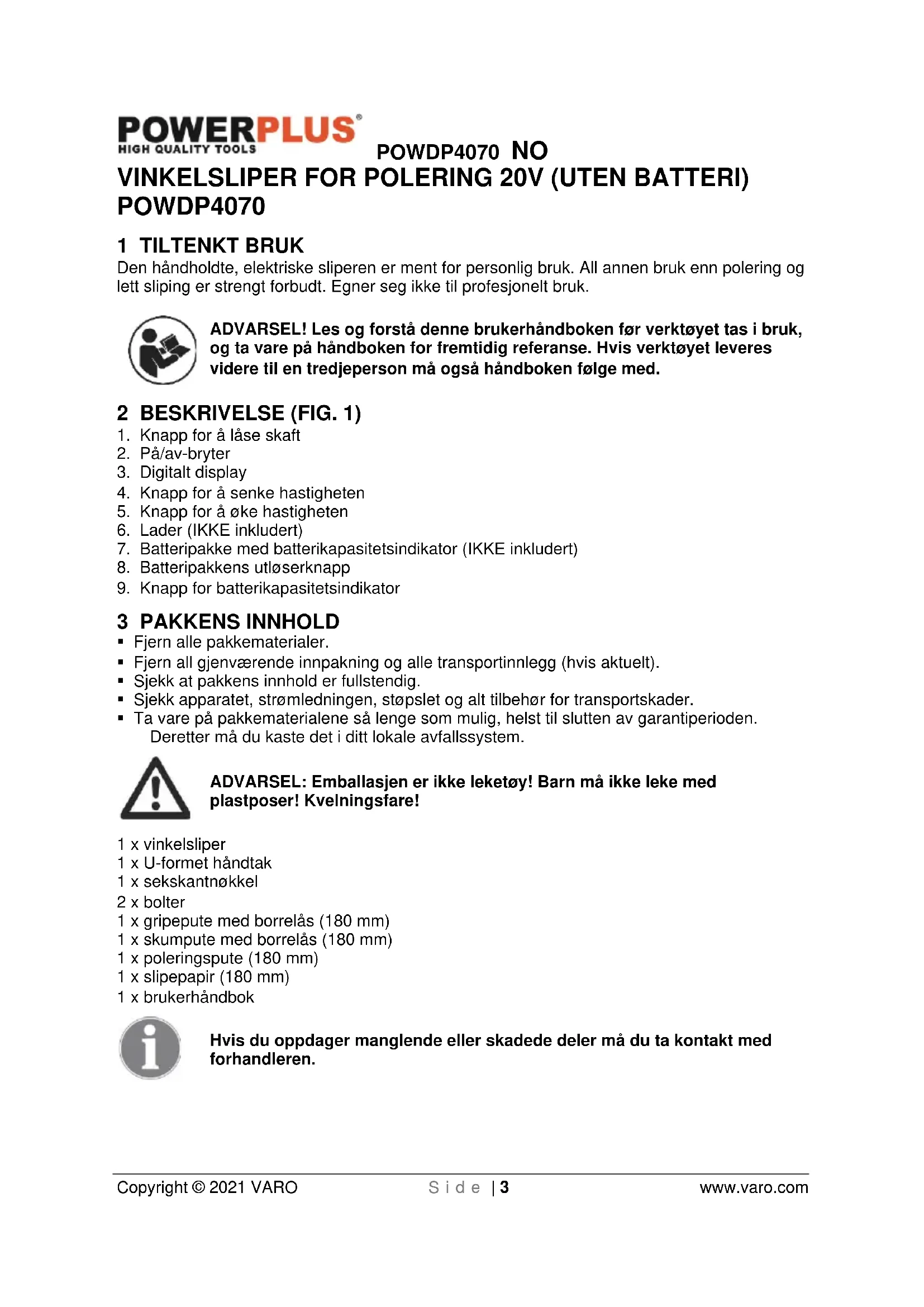 - Under ekstreme forhold kan batterier lekke. Hvis du oppdager væske på batterier, må du gjøre som følger: − Tørk forsiktig av væsken med en klut. Unngå hudkontakt. − Ved hud- eller øyekontakt må du følge instruksjonene nedenfor: ✓ Skyll øyeblikkelig med vann. Nøytraliser med en mild syre som f. eks sitronsaft eller eddik. ✓ Hvis du får batterisyre i øynene, må øynene skylles i minst 10 minutter med rent vann. Oppsøk lege. Brannfare! Unngå å kortslutte polene på en løst batteri. Batterier må ikke brennes.POWDP4070 NO Copyright © 2021 VARO S i d e | 7 www.varo.com
