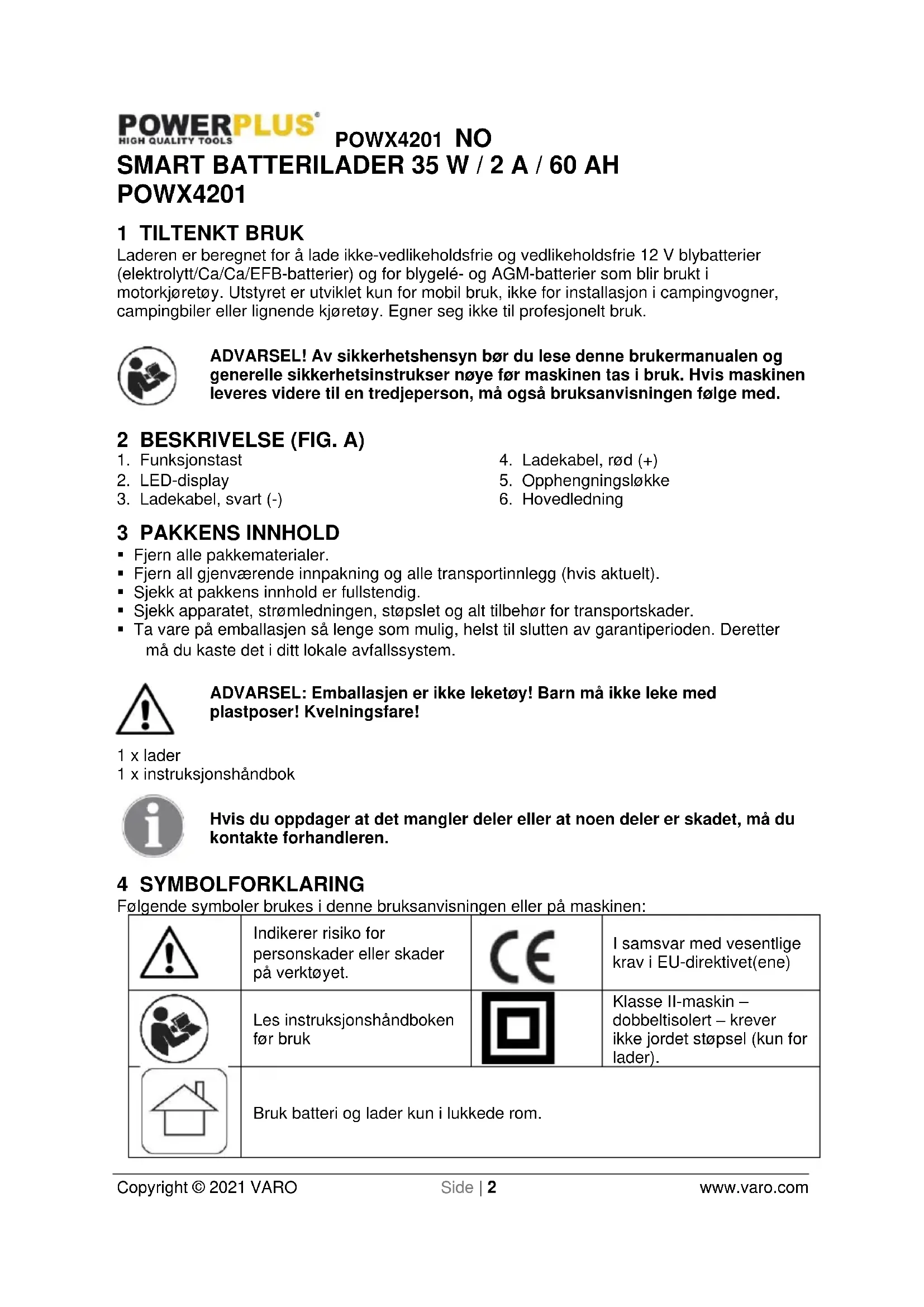 POWX4201 1 TILTENKT BRUK Laderen er beregnet for å lade ikke-vedlikeholdsfrie og vedlikeholdsfrie 12 V blybatterier (elektrolytt/Ca/Ca/EFB-batterier) og for blygelé- og AGM-batterier som blir brukt i motorkjøretøy. Utstyret er utviklet kun for mobil bruk, ikke for installasjon i campingvogner, campingbiler eller lignende kjøretøy. Egner seg ikke til profesjonelt bruk. ADVARSEL! Av sikkerhetshensyn bør du lese denne brukermanualen og generelle sikkerhetsinstrukser nøye før maskinen tas i bruk. Hvis maskinen leveres videre til en tredjeperson, må også bruksanvisningen følge med. 2 BESKRIVELSE (FIG. A)