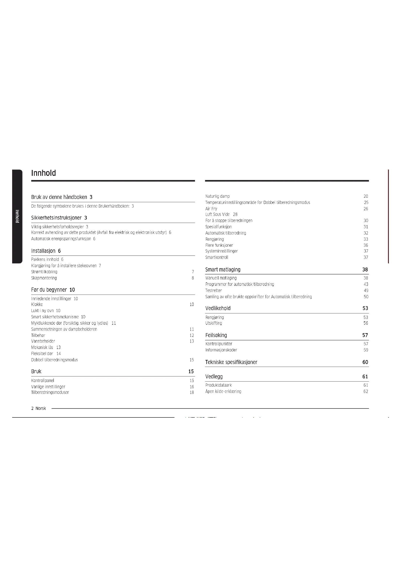 Chamada para a rede xa nacional Dias úteis das 9h às 20h www.samsung.com/pt/support SPAIN 91 175 00 15 www.samsung.com/es/support SWEDEN 0771-400 300 www.samsung.com/se/support SWITZERLAND 0800 726 786 www.samsung.com/ch/support (German) www.samsung.com/ch_fr/support (French) UK 0333 000 0333 www.samsung.com/uk/support IRELAND (EIRE) 0818 717100 www.samsung.com/ie/support DG68-01412A-04Innebygget ovn Bruker- og installasjonshåndbok NV7B564**** / NV7B565**** / NV7B566**** / NV7B567**** / NV7B568**** / NV7B564**C* / NV7B566**C* / NV7B568**C* / NV7B574**** / NV7B575**** / NV7B576**** / NV7B577**** / NV7B578****2 Norsk Innhold Innhold Bruk av denne håndboken 3 De følgende symbolene brukes i denne Brukerhåndboken: 3 Sikkerhetsinstruksjoner 3 Viktig sikkerhetsforholdsregler 3 Korrekt avhending av dette produktet (Avfall fra elektrisk og elektronisk utstyr) 6 Automatisk energisparingsfunksjon 6 Installasjon 6 Pakkens innhold 6 Klargjøring for å installere stekeovnen 7 Strømtilkobling 7 Skapmontering 8 Før du begynner 10 Innledende innstillinger 10 Klokke 10 Lukt i ny ovn 10 Smart sikkerhetsmekanisme 10 Myktlukkende dør (forsiktig, sikker og lydløs) 11 Sammensetningen av dampbeholderen 11 Tilbehør 12 Vannbeholder 13 Mekanisk lås 13 Fleksibel dør 14 Dobbel tilberedningsmodus 15 Bruk 15 Kontrollpanel 15 Vanlige innstillinger 16 Tilberedningsmoduser 18 Naturlig damp 20 Temperaturinnstillingsområde for Dobbel tilberedningsmodus 25 Air Fry 26 Luft Sous Vide 28 For å stoppe tilberedningen 30 Spesialfunksjon 31 Automatisk tilberedning 32 Rengjøring 33 Flere funksjoner 36 Systeminnstillinger 37 Smartkontroll 37 Smart matlaging 38 Manuell matlaging 38 Programmer for automatisk tilberedning 43 Testretter 49 Samling av ofte brukte oppskrifter for Automatisk tilberedning 50 Vedlikehold 53 Rengjøring 53 Utskifting 56 Feilsøking 57 Kontrollpunkter 57 Informasjonskoder 59 Tekniske spesikasjoner 60 Vedlegg 61 Produktdataark 61 Åpen kilde-erklæring 62Norsk 3 Bruk av denne håndboken Bruk av denne håndboken Takk for at du valgte en SAMSUNG innebygget ovn. Denne brukerhåndboken inneholder viktig informasjon om sikkerhet og instruksjoner som er ment som hjelp ved bruk og vedlikehold av apparatet ditt. Ta deg tid til å lese denne brukerhåndboken før du bruker ovnen og ta vare på denne boken for fremtidig referanse. De følgende symbolene brukes i denne Brukerhåndboken: ADVARSEL Fare eller usikker bruk som kan medføre alvorlige personskader, død og/eller skade på eiendom. FORSIKTIG Fare eller usikker bruk som kan medføre personskader og/eller skade på eiendom. MERK Nyttige tips, anbefalinger eller informasjon som hjelper brukerne med håndtering av produktet. Sikkerhetsinstruksjoner Installasjon av denne ovnen må utføres av en autorisert elektriker. Installatøren er ansvarlig for tilkobling av apparatet til strømnettet i henhold til aktuelle sikkerhetsanbefalinger. VIKTIG SIKKERHETSFORHOLDSREGLER ADVARSEL Dette apparatet skal ikke brukes av personer (inkludert barn) med svekkede fysiske, sensoriske eller mentale evner eller av personer som mangler relevant erfaring og kunnskap, med mindre de er under oppsyn eller får instruksjoner av en person som er ansvarlig for deres sikkerhet. Barn må være under oppsyn for å sikre at de ikke leker med apparatet. Innretningen for frakobling må være innlemmet i den faste kablingen i henhold til kablingsregler. Det må være mulig å koble apparatet fra strømforsyningen etter installasjonen. Frakoblingen kan oppnås ved å ha støpselet tilgjengelig eller ved å legge inn en bryter i kablingen i samsvar med kablingsreglene. Hvis strømledningen blir skadet, må den byttes ut av produsenten, produsentens serviceagent eller en annen kvalisert person for å unngå farer.4 Norsk Sikkerhetsinstruksjoner Sikkerhetsinstruksjoner Den angitte festemetoden må ikke være avhengig av bruk av klebemidler, ettersom dette ikke regnes som en pålitelig festemetode. Dette apparatet kan brukes av barn fra åtte år og oppover og av personer med reduserte fysiske, sensoriske eller mentale evner, eller som mangler erfaring og kunnskap, såfremt de holdes under oppsyn eller er blitt instruert i trygg bruk av apparatet og forstår farene som er involvert. Barn skal ikke leke med apparatet. Rengjøring og vedlikehold som kan utføres av brukeren, må ikke utføres av barn uten oppsyn. Hold apparatet og ledningen utenfor rekkevidden til barn under 8 år. Under bruk blir apparatet varmt. Unngå å berøre varmeelementene inne i ovnen. ADVARSEL: Tilgjengelige deler kan bli varme under bruk. Små barn må holdes unna. Ikke bruk sterke slipemidler eller metallskrape til å rengjøre glasset i ovnsdøren. Dette kan føre til at overaten blir skrapet opp slik at glasset knuses. Hvis apparatet har rengjøringsfunksjon, må ekstra søl være ernet før rengjøring og alt redskap skal være ernet fra ovnen under damprengjøring eller selvrensing. Rengjøringsfunksjonen avhenger av modellen. Hvis dette apparatet har rensingsfunksjoner, kan overatene bli varmere enn vanlig under selvrensingen, og barn bør holdes unna mens dette utføres. For apparater med pyrolytisk renseprosess kan noen dyr, spesielt fugler være sensitive for gasser og lokale temperatursvingninger under den pyrolytiske renseprosessen og bør yttes til et passende, godt ventilert område under denne prosessen. Ventiler rommet under og etter pyro-renseprosessen. Rengjøringsfunksjonen avhenger av modellen. Bruk bare steketermometeret som anbefales for denne ovnen. (Bare steketermometermodell) Det skal ikke brukes en damprenser. ADVARSEL: Kontroller at apparatet er slått av før du skifter lyspæren for å unngå muligheten for elektrisk støt. For å unngå overoppvarming må apparatet ikke monteres bak en dekorativ dør. ADVARSEL: Dette apparatet og deler man kan komme borti, blir varme under bruk. Unngå å berøre varmeelementene. Barn under 8 år må holdes unna med mindre de er under kontinuerlig o