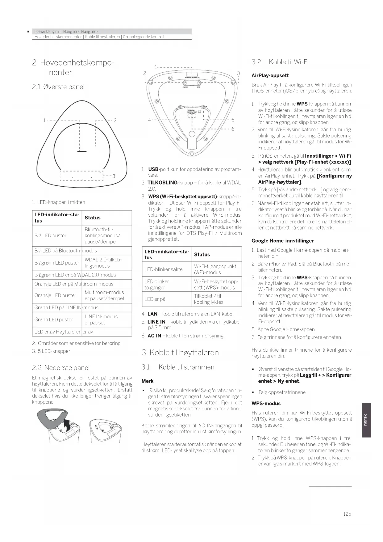 dikator – Utløser Wi-Fi-oppsett for Play-Fi. Trykk og hold inne knappen i tre sekunder for å aktivere WPS-modus. Trykk og hold inne knappen i åtte sekunder for å aktivere AP-modus. I AP-modus er alle innstillingene for DTS Play-FI / Multiroom gjenopprettet. LED-indikator-sta- tus Status LED-blinker sakte Wi-Fi-tilgangspunkt (AP)-modus LED blinker to ganger Wi-Fi-beskyttet opp- sett (WPS)-modus LED er på Tilkoblet / til- kobling lyktes