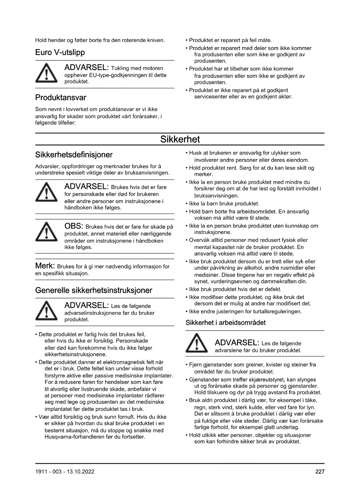 1911 - 003 - 13.10.2022Hold hender og føtter borte fra den roterende kniven. Euro V-utslipp ADVARSEL: Tukling med motoren opphever EU-type-godkjenningen til dette produktet. Produktansvar Som nevnt i lovverket om produktansvar er vi ikke ansvarlig for skader som produktet vårt forårsaker, i følgende tilfeller: