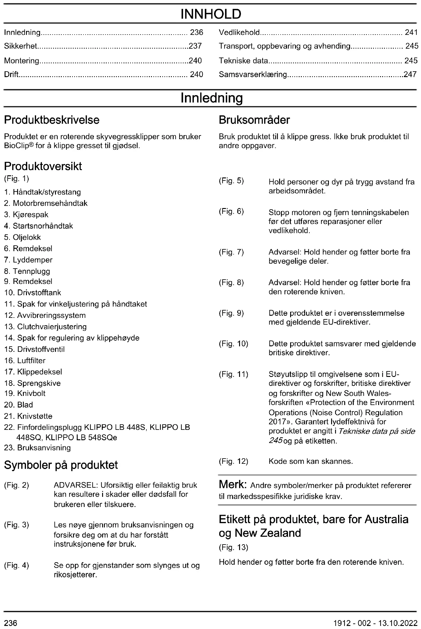 Symboler på produktet (Fig. 2) ADVARSEL: Uforsiktig eller feilaktig bruk kan resultere i skader eller dødsfall for brukeren eller tilskuere. (Fig. 3) Les nøye gjennom bruksanvisningen og forsikre deg om at du har forstått instruksjonene før bruk. (Fig. 4) Se opp for gjenstander som slynges ut og rikosjetterer. (Fig. 5) Hold personer og dyr på trygg avstand fra arbeidsområdet. (Fig. 6) Stopp motoren og fjern tenningskabelen før det utføres reparasjoner eller vedlikehold. (Fig. 7) Advarsel: Hold hender og føtter borte fra bevegelige deler. (Fig. 8) Advarsel: Hold hender og føtter borte fra den roterende kniven. (Fig. 9) Dette produktet er i overensstemmelse med gjeldende EU-direktiver. (Fig. 10) Dette produktet samsvarer med gjeldende britiske direktiver. (Fig. 11) Støyutslipp til omgivelsene som i EU- direktiver og forskrifter, britiske direktiver og forskrifter og New South Wales- forskriften «Protection of the Environment Operations (Noise Control) Regulation 2017». Garantert lydeffektnivå for produktet er angitt i Tekniske data på side