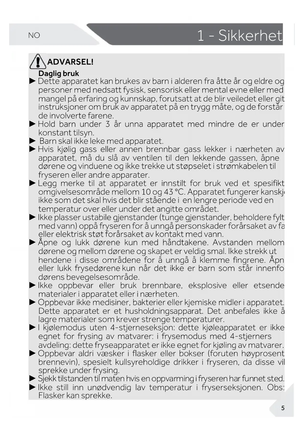 ADVARSEL! Daglig bruk ► Dette apparatet kan brukes av barn i alderen fra åtte år og eldre og personer med nedsatt fysisk, sensorisk eller mental evne eller med mangel på erfaring og kunnskap, forutsatt at de blir veiledet eller gitt instruksjoner om bruk av apparatet på en trygg måte, og de forstår de involverte farene. ► Hold barn under 3 år unna apparatet med mindre de er under konstant tilsyn. ► Barn skal ikke leke med apparatet. ► Hvis kjølig gass eller annen brennbar gass lekker i nærheten av apparatet, må du slå av ventilen til den lekkende gassen, åpne dørene og vinduene og ikke trekke ut støpselet i strømkabelen til fryseren eller andre apparater. ► Legg merke til at apparatet er innstilt for bruk ved et spesifikt omgivelsesområde mellom 10 og 43 °C. Apparatet fungerer kanskje ikke som det skal hvis det blir stående i en lengre periode ved en temperatur over eller under det angitte området. ► Ikke plasser ustabile gjenstander (tunge gjenstander, beholdere fylt med vann) oppå fryseren for å unngå personskader forårsaket av fall eller elektrisk støt forårsaket av kontakt med vann. ► Åpne og lukk dørene kun med håndtakene. Avstanden mellom dørene og mellom dørene og skapet er veldig smal. Ikke strekk ut hendene i disse områdene for å unngå å klemme fingrene. Åpne eller lukk frysedørene kun når det ikke er barn som står innenfor dørens bevegelsesområde. ► Ikke oppbevar eller bruk brennbare, eksplosive eller etsende materialer i apparatet eller i nærheten. ► Oppbevar ikke medisiner, bakterier eller kjemiske midler i apparatet. Dette apparatet er et husholdningsapparat. Det anbefales ikke å lagre materialer som krever strenge temperaturer. ► I kjølemodus uten 4-stjerneseksjon: dette kjøleapparatet er ikke egnet for frysing av matvarer: i frysemodus med 4-stjerners avdeling: dette fryseapparatet er ikke egnet for kjøling av matvarer. ► Oppbevar aldri væsker i flasker eller bokser (foruten høyprosent brennevin), spesielt kullsyreholdige drikker i fryseren, da disse vil sprekke under frysing. ► Sjekk tilstanden til maten hvis en oppvarming i fryseren har funnet sted. ► Ikke still inn unødvendig lav temperatur i fryserseksjonen. Obs: Flasker kan sprekke.1 - Sikkerhet