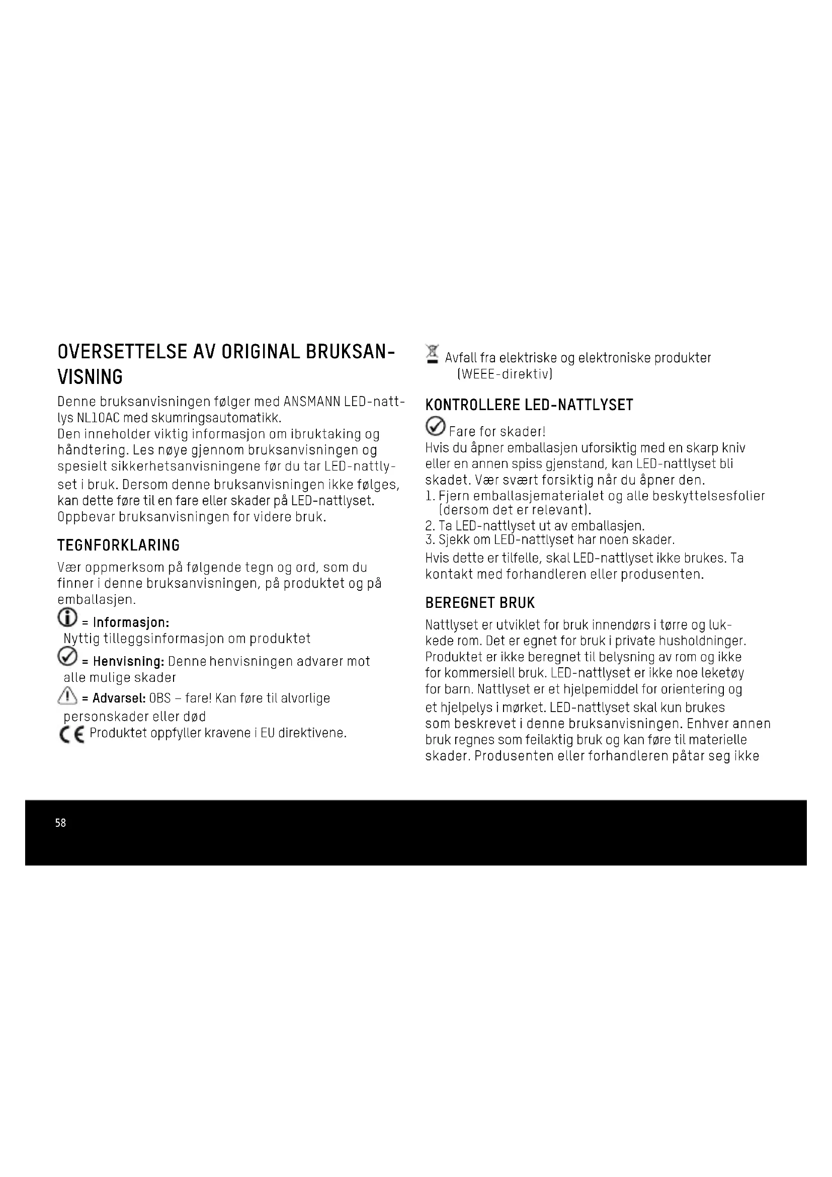 VISNING Denne bruksanvisningen følger med ANSMANN LED-natt- lys NL10AC med skumringsautomatikk. Den inneholder viktig informasjon om ibruktaking og håndtering. Les nøye gjennom bruksanvisningen og spesielt sikkerhetsanvisningene før du tar LED-nattly- set i bruk. Dersom denne bruksanvisningen ikke følges, kan dette føre til en fare eller skader på LED-nattlyset. Oppbevar bruksanvisningen for videre bruk. TEGNFORKLARING Vær oppmerksom på følgende tegn og ord, som du finner i denne bruksanvisningen, på produktet og på emballasjen. = Informasjon: Nyttig tilleggsinformasjon om produktet = Henvisning: Denne henvisningen advarer mot alle mulige skader = Advarsel: OBS – fare! Kan føre til alvorlige personskader eller død Produktet oppfyller kravene i EU direktivene. Avfall fra elektriske og elektroniske produkter (WEEE-direktiv) KONTROLLERE LED-NATTLYSET Fare for skader! Hvis du åpner emballasjen uforsiktig med en skarp kniv eller en annen spiss gjenstand, kan LED-nattlyset bli skadet. Vær svært forsiktig når du åpner den.