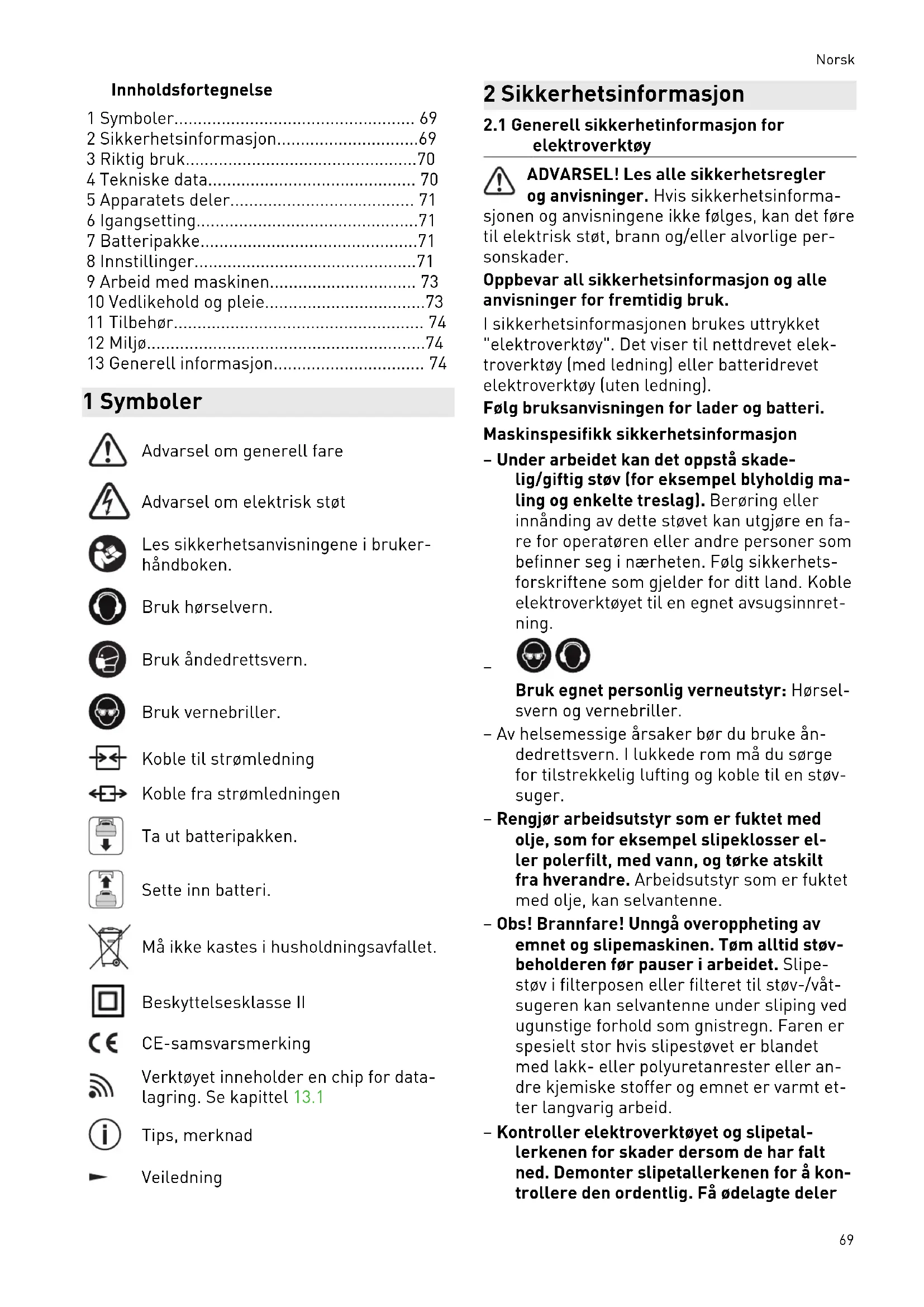 Bruk egnet personlig verneutstyr: Hørsel svern og vernebriller. – Av helsemessige årsaker bør du bruke ån dedrettsvern. I lukkede rom må du sørge for tilstrekkelig lufting og koble til en støv suger. – Rengjør arbeidsutstyr som er fuktet med olje, som for eksempel slipeklosser el ler polerfilt, med vann, og tørke atskilt fra hverandre. Arbeidsutstyr som er fuktet med olje, kan selvantenne. – Obs! Brannfare! Unngå overoppheting av emnet og slipemaskinen. Tøm alltid støv beholderen før pauser i arbeidet. Slipe støv i filterposen eller filteret til støv-/våt sugeren kan selvantenne under sliping ved ugunstige forhold som gnistregn. Faren er spesielt stor hvis slipestøvet er blandet med lakk- eller polyuretanrester eller an dre kjemiske stoffer og emnet er varmt et ter langvarig arbeid. – Kontroller elektroverktøyet og slipetal lerkenen for skader dersom de har falt ned. Demonter slipetallerkenen for å kon trollere den ordentlig. Få ødelagte deler Norsk 69reparert før bruk. Knekte slipetallerkener og skadde maskiner kan føre til skader og at maskinen ikke lenger er sikker. – Det kan oppstå elektrisk ladning når Longlife-støvposen brukes. Bruk alltid en antistatisk sugeslange (AS) sammen med elektroverktøyet. Lettere elektriske støt kan føre til at man skvetter og blir mindre oppmerksom, noe som kan forårsake ulyk ker. – Bruk nettadapteren kun med dette appara tet. – Bruk nettadapteren kun med en original plug it-kabel fra Festool. – Bruk kun de batteripakkene som er be regnet til formålet, og ikke bruk strø madaptere til dette batteridrevne elektro verktøyet. Ikke lad batteripakken med la dere fra andre produsenter. Bruker du tilbehør som ikke er godkjent av produsen ten, kan dette føre til elektrisk støt og/eller alvorlige ulykker.