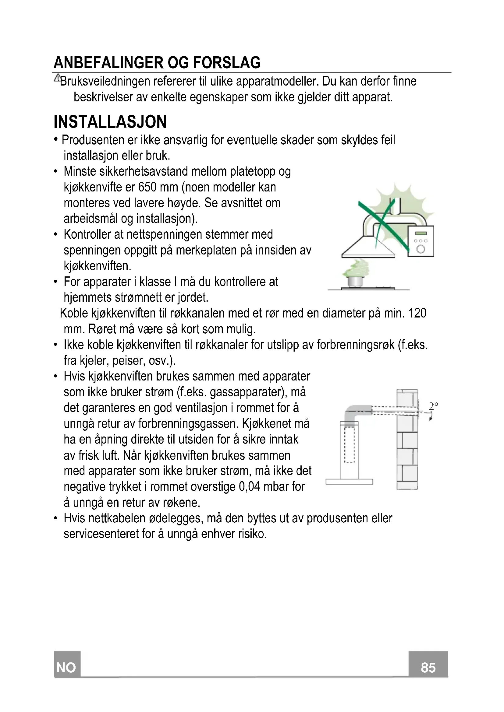 - For apparater i klasse I må du kontrollere at hjemmets strømnett er jordet. Koble kjøkkenviften til røkkanalen med et rør med en diameter på min. 120 mm. Røret må være så kort som mulig.