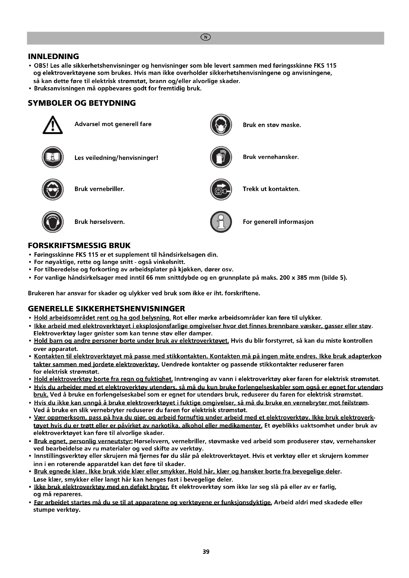 - OBS! Les alle sikkerhetshenvisninger og henvisninger som ble levert sammen med føringsskinne FKS 115 og elektroverktøyene som brukes. Hvis man ikke overholder sikkerhetshenvisningene og anvisningene, så kan dette føre til elektrisk strømstøt, brann og/eller alvorlige skader.