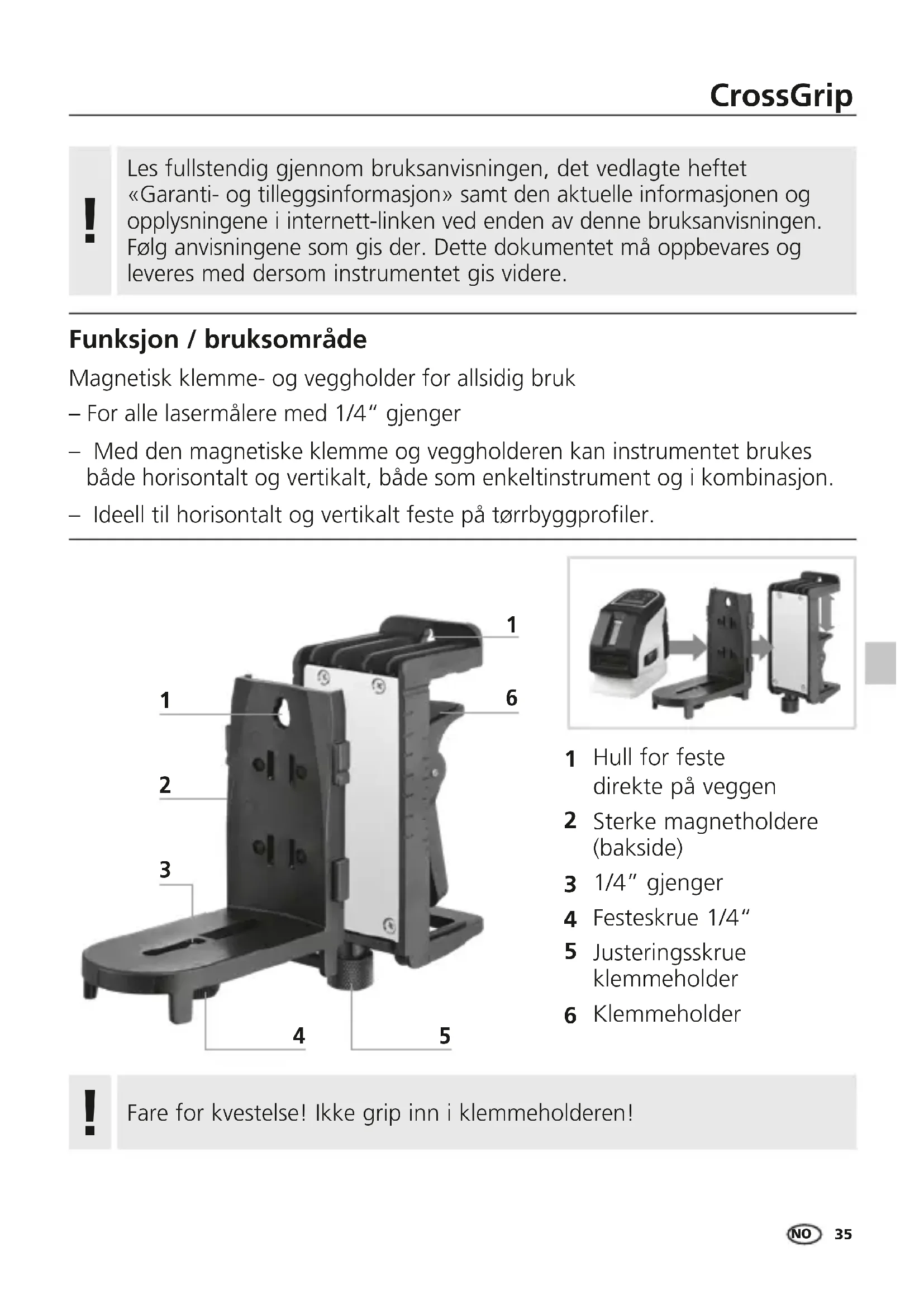 Funksjon / bruksområde Magnetisk klemme- og veggholder for allsidig bruk – For alle lasermålere med 1/4“ gjenger – Med den magnetiske klemme og veggholderen kan instrumentet brukes både horisontalt og vertikalt, både som enkeltinstrument og i kombinasjon. – Ideell til horisontalt og vertikalt feste på tørrbyggproler. Les fullstendig gjennom bruksanvisningen, det vedlagte heftet «Garanti- og tilleggsinformasjon» samt den aktuelle informasjonen og opplysningene i internett-linken ved enden av denne bruksanvisningen. Følg anvisningene som gis der. Dette dokumentet må oppbevares og leveres med dersom instrumentet gis videre.