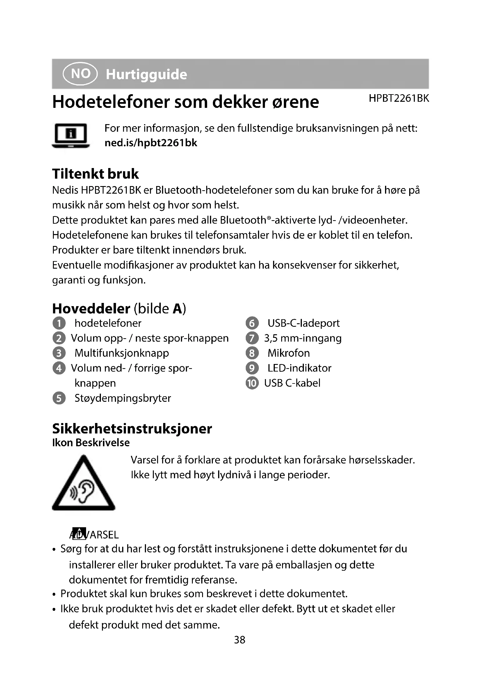 Hurtigguide Hodetelefoner som dekker ørene HPBT2261BKFor mer informasjon, se den fullstendige bruksanvisningen på nett: ned.is/hpbt2261bk Tiltenkt bruk Nedis HPBT2261BK er Bluetooth-hodetelefoner som du kan bruke for å høre på musikk når som helst og hvor som helst.Dette produktet kan pares med alle Bluetooth®-aktiverte lyd- /videoenheter.Hodetelefonene kan brukes til telefonsamtaler hvis de er koblet til en telefon.Produkter er bare tiltenkt innendørs bruk.Eventuelle modikasjoner av produktet kan ha konsekvenser for sikkerhet, garanti og funksjon. Hoveddeler (bilde A) 1 hodetelefoner 2 Volum opp- / neste spor-knappen 3 Multifunksjonknapp 4 Volum ned- / forrige spor- knappen 5 Støydempingsbryter 6 USB-C-ladeport 7 3,5 mm-inngang 8 Mikrofon 9 LED-indikator q USB C-kabel Sikkerhetsinstruksjoner Ikon BeskrivelseVarsel for å forklare at produktet kan forårsake hørselsskader. Ikke lytt med høyt lydnivå i lange perioder. ADVARSEL• Sørg for at du har lest og forstått instruksjonene i dette dokumentet før du installerer eller bruker produktet. Ta vare på emballasjen og dette dokumentet for fremtidig referanse.• Produktet skal kun brukes som beskrevet i dette dokumentet.• Ikke bruk produktet hvis det er skadet eller defekt. Bytt ut et skadet eller defekt produkt med det samme.39