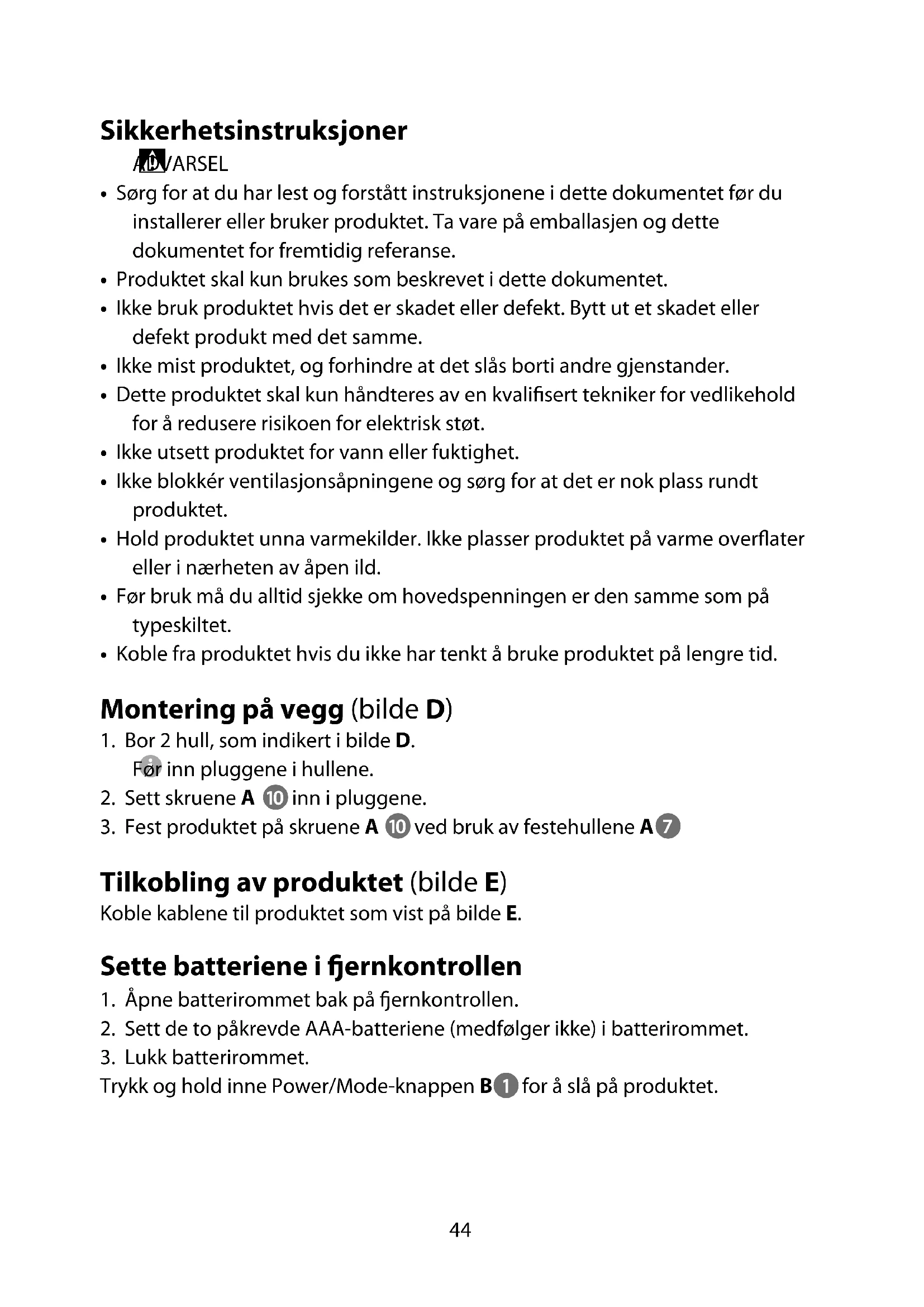 - Ikke utsett produktet for vann eller fuktighet.