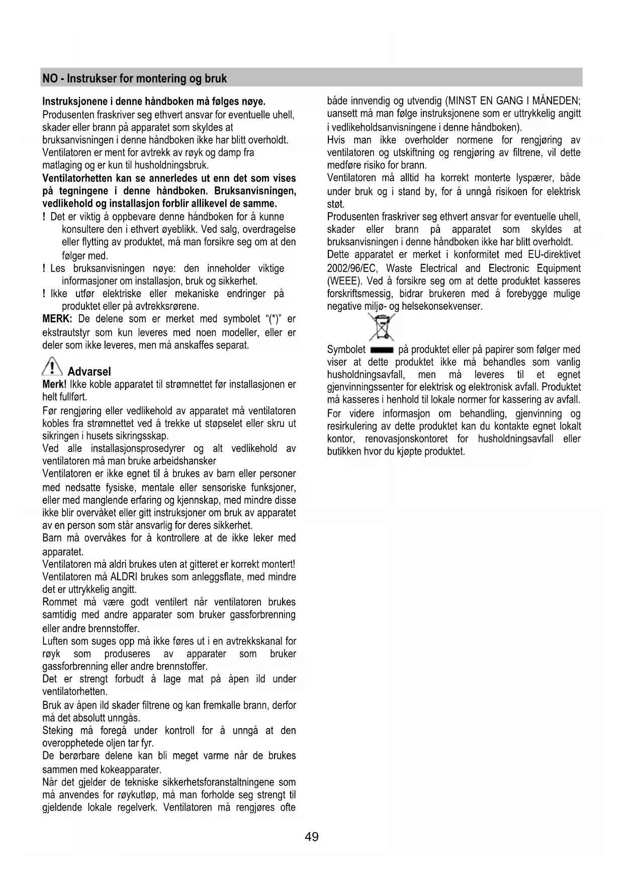 Jos valaistus ei toimi, tarkista että lamput on asennettu oikein paikoilleen ennen kuin otat yhteyttä tekniseen tukeen.49 NO - Instrukser for montering og bruk Instruksjonene i denne håndboken må følges nøye. Produsenten fraskriver seg ethvert ansvar for eventuelle uhell, skader eller brann på apparatet som skyldes at bruksanvisningen i denne håndboken ikke har blitt overholdt. Ventilatoren er ment for avtrekk av røyk og damp fra matlaging og er kun til husholdningsbruk. Ventilatorhetten kan se annerledes ut enn det som vises på tegningene i denne håndboken. Bruksanvisningen, vedlikehold og installasjon forblir allikevel de samme. ! Det er viktig å oppbevare denne håndboken for å kunne konsultere den i ethvert øyeblikk. Ved salg, overdragelse eller flytting av produktet, må man forsikre seg om at den følger med. ! Les bruksanvisningen nøye: den inneholder viktige informasjoner om installasjon, bruk og sikkerhet. ! Ikke utfør elektriske eller mekaniske endringer på produktet eller på avtrekksrørene. MERK: De delene som er merket med symbolet “(*)” er ekstrautstyr som kun leveres med noen modeller, eller er deler som ikke leveres, men må anskaffes separat. Advarsel Merk! Ikke koble apparatet til strømnettet før installasjonen er helt fullført. Før rengjøring eller vedlikehold av apparatet må ventilatoren kobles fra strømnettet ved å trekke ut støpselet eller skru ut sikringen i husets sikringsskap. Ved alle installasjonsprosedyrer og alt vedlikehold av ventilatoren må man bruke arbeidshansker Ventilatoren er ikke egnet til å brukes av barn eller personer med nedsatte fysiske, mentale eller sensoriske funksjoner, eller med manglende erfaring og kjennskap, med mindre disse ikke blir overvåket eller gitt instruksjoner om bruk av apparatet av en person som står ansvarlig for deres sikkerhet. Barn må overvåkes for å kontrollere at de ikke leker med apparatet. Ventilatoren må aldri brukes uten at gitteret er korrekt montert! Ventilatoren må ALDRI brukes som anleggsflate, med mindre det er uttrykkelig angitt. Rommet må være godt ventilert når ventilatoren brukes samtidig med andre apparater som bruker gassforbrenning eller andre brennstoffer. Luften som suges opp må ikke føres ut i en avtrekkskanal for røyk som produseres av apparater som bruker gassforbrenning eller andre brennstoffer. Det er strengt forbudt å lage mat på åpen ild under ventilatorhetten. Bruk av åpen ild skader filtrene og kan fremkalle brann, derfor må det absolutt unngås. Steking må foregå under kontroll for å unngå at den overopphetede oljen tar fyr. De berørbare delene kan bli meget varme når de brukes sammen med kokeapparater. Når det gjelder de tekniske sikkerhetsforanstaltningene som må anvendes for røykutløp, må man forholde seg strengt til gjeldende lokale regelverk. Ventilatoren må rengjøres ofte både innvendig og utvendig (MINST EN GANG I MÅNEDEN; uansett må man følge instruksjonene som er uttrykkelig angitt i vedlikeholdsanvisningene i denne håndboken). Hvis man ikke overholder normene for rengjøring av ventilatoren og utskiftning og rengjøring av filtrene, vil dette medføre risiko for brann. Ventilatoren må alltid ha korrekt monterte lyspærer, både under bruk og i stand by, for å unngå risikoen for elektrisk støt. Produsenten fraskriver seg ethvert ansvar for eventuelle uhell, skader eller brann på apparatet som skyldes at bruksanvisningen i denne håndboken ikke har blitt overholdt. Dette apparatet er merket i konformitet med EU-direktivet 2002/96/EC, Waste Electrical and Electronic Equipment (WEEE). Ved å forsikre seg om at dette produktet kasseres forskriftsmessig, bidrar brukeren med å forebygge mulige negative miljø- og helsekonsekvenser. Symbolet på produktet eller på papirer som følger med viser at dette produktet ikke må behandles som vanlig husholdningsavfall, men må leveres til et egnet gjenvinningssenter for elektrisk og elektronisk avfall. Produktet må kasseres i henhold til lokale normer for kassering av avfall. For videre informasjon om behandling, gjenvinning og resirkulering av dette produktet kan du kontakte egnet lokalt kontor, renovasjonskontoret for husholdningsavfall eller butikken hvor du kjøpte produktet.50 Bruksmåte Ventilatorhetten er laget for å brukes med direkte avtrekk der avtrekksluften føres ut i friluft, eller med resirkulering av avtrekksluften. Direkte avtrekk Dampene føres ut i friluft gjennom et avløpsrør som er festet til koblingsflensen. Diameteren i avløpsrøret må tilsvare diameteren på tilslutningsringen. Bemerk! Avløpsrøret er ikke medlevert, men må kjøpes separat. På den vannrette delen skal røret ha en lett inklinasjon oppover (cirka 10°), slik at det lettere kan føre ut luften. Hvis ventilatoren er utstyrt med kullfiltre, må disse fjernes. Koble ventilatoren til rør og avtrekksåpning i veggen med en diameter tilsvarende luftuttaket (koblingsflensen). Bruk av rør og avtrekksåpning på veggen med en mindre diameter, vil medføre en minsking i avtrekksytelsene og en drastisk økning av støyen. Ethvert ansvar gjeldende dette fraskrives derfor. ! Bruk et så kort rør som mulig. ! Bruk et rør med færrest mulig vinkler (vinkelen må aldri være skarpere enn 90°). ! Unngå drastiske endringer i rørets tverrsnitt. ! Bruk et rør som er så glatt som mulig på innsiden. ! Rørmaterialet må være godkjent etter gjeldende normer. Resirkulering av luften Luften som suges opp blir renset, og fett og lukter fjernes før den føres tilbake i rommet. Hvis man vil bruke ventilatoren i denne versjonen, er det nødvendig å installere et ekstra filtersystem basert på aktivt kull. Modellene uten sugemotor fungerer kun med direkte avtrekk og må kobles til en eksentrisk sugeenhet (ikke medlevert). Instruksjonene for tilkobling leveres sammen med den eksentriske sugeenheten. Installasjon Minimumsavstanden mellom koketoppen og undersiden av kjøkkenventilatoren må ikke v