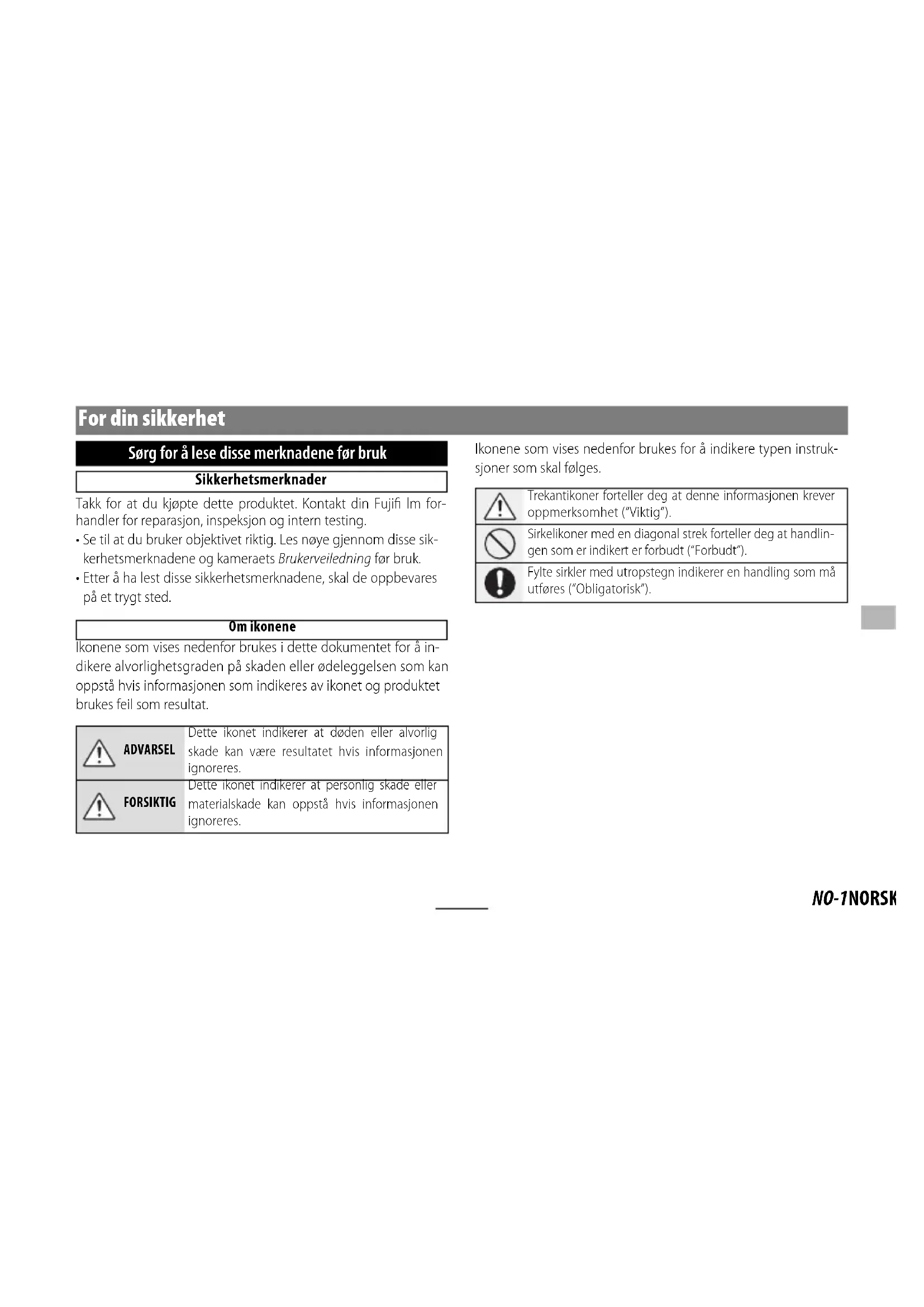 - Etter å ha lest disse sikkerhetsmerknadene, skal de oppbevares på et trygt sted. Om ikonene Ikonene som vises nedenfor brukes i dette dokumentet for å in- dikere alvorlighetsgraden på skaden eller ødeleggelsen som kan oppstå hvis informasjonen som indikeres av ikonet og produktet brukes feil som resultat. ADVARSELDette ikonet indikerer at døden eller alvorlig skade kan være resultatet hvis informasjonen ignoreres.FORSIKTIGDette ikonet indikerer at personlig skade eller materialskade kan oppstå hvis informasjonen ignoreres. Ikonene som vises nedenfor brukes for å indikere typen instruk- sjoner som skal følges. Trekantikoner forteller deg at denne informasjonen krever oppmerksomhet (“Viktig”).Sirkelikoner med en diagonal strek forteller deg at handlin-gen som er indikert er forbudt (“Forbudt”).Fylte sirkler med utropstegn indikerer en handling som må utføres (“Obligatorisk”).NO-2 NORSK