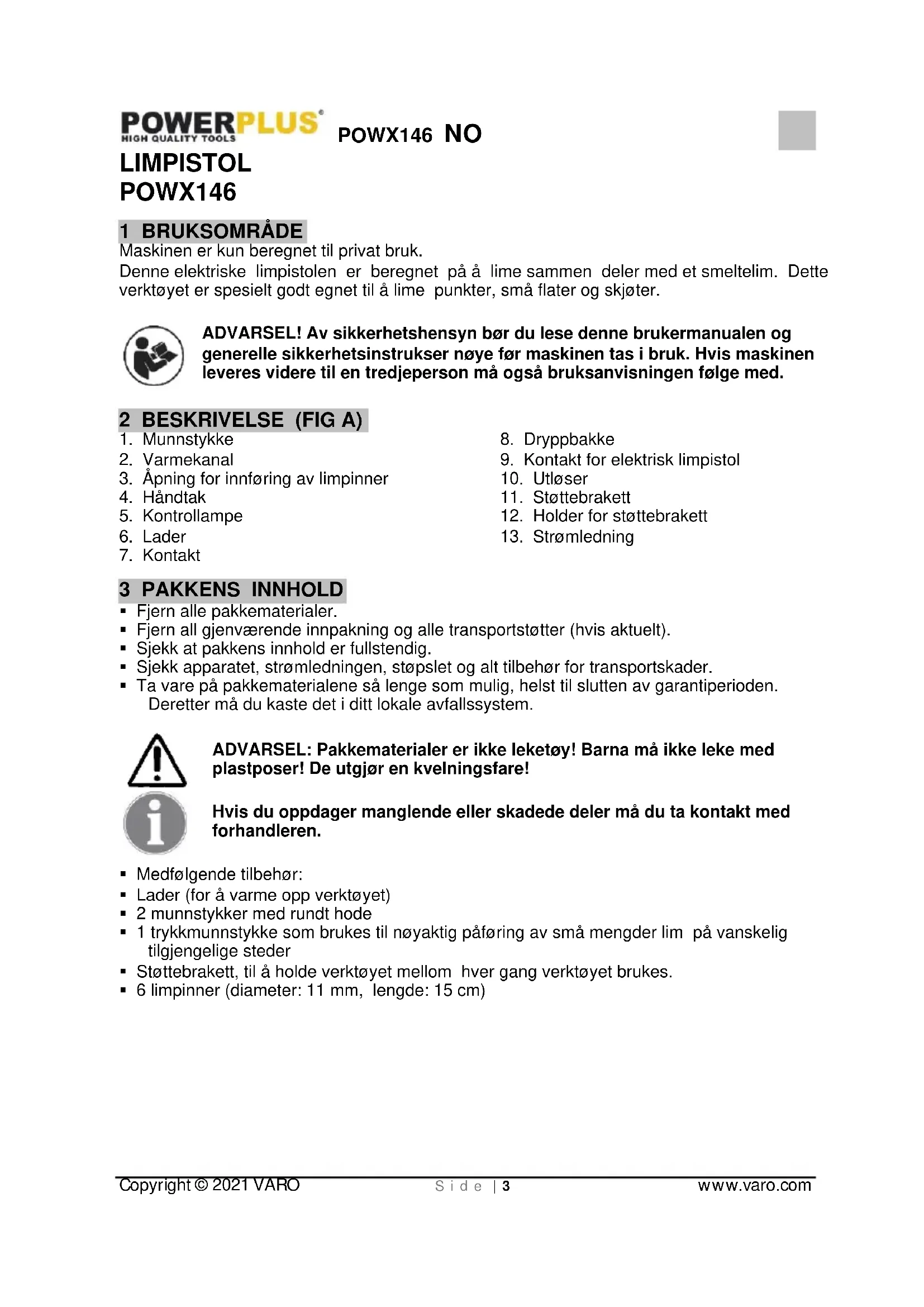 Fjern kalde limrester med et skrapt verktøy, eller legg munnstykket i varmt vann slik at limet mykner og kan fjernes for hånd. 10 TEKNISKE DATA Spenning / Frekvens 220-240V / 50Hz Effekt 25W (500W) 11 SERVICEAVDELING Skadede brytere må byttes ut av vårt serviceverksted. Hvis det oppstår skade på strømkabelen (eller støpslet), må denne byttes ut med en ny spesialkabel som fås kjøpt hos vår kundeservice. Strømkabelen må bare skiftes av vår kundeservice (se siste side) eller av en kvalifisert person (elektriker). 12 OPPBEVARING Gjør maskinen og tilbehøret grundig rent. Oppbevar maskinen utenfor barnas rekkevidde, i stabil og sikker stilling, på et kjølig og tørt sted. Unngå for høye eller lave temperaturer. Beskytt maskinen mot direkte sollys. Oppbevar den om mulig i mørke. Ikke oppbevar maskinen under plast, dette skaper fuktighet. Før oppbevaring må limpistolen være helt avkjølt. Ikke heng verktøyet opp etter strømledningen. 13 FEILSØKING Verktøyet slås ikke på. Støpslet står ikke i stikkontakten. Sett støpslet i stikkontakten. Strømledningen er defekt. Få strømledningen skiftet ut av en kvalifisert tekniker. Verktøyet er overopphetet La verktøyet kjøles ned i noen minutter og forsøk å slå det på igjen. Munnstykket sitter skjevt i verktøyet Munnstykket har kilt seg fast. Ta ut munnstykket og sett det korrekt inn på gjengene igjen. Smeltelimet er ikke flytende nok. Ikke nok oppvarming. La verktøyet varmes opp mer. Få verktøyet sjekket av en kvalifisert tekniker.POWX146 NO Copyright © 2021 VARO S i d e | 9 www.varo.com 14 GARANTI Dette produktet garanteres for en periode på 36 måneder fra datoen produktet ble kjøpt av første bruker. Denne garantien dekker alle material- eller produksjonsfeil, med unntak av: batterier, ladere, defekte deler som følge av vanlig slitasje, f.eks. lagre, børster, kabler og plugger eller tilbehør som bor, borebits, sagblader osv. eller skader eller feil som skyldes feil bruk, uhell eller endringer. Garantien dekker heller ikke kostnader ved forsendelse. Skader og/eller defekter som skyldes ukorrekt bruk dekkes heller ikke av garantien. Vi fraskriver oss også alt ansvar for personskader som skyldes ukorrekt bruk av verktøyet. Reparasjoner må utføres ved et autorisert kundeservicesenter for Pow erplus verktøy. Du kan alltid få flere opplysninger ved å ringe 00 32 3 292 92 90. Alle transportkostnader skal alltid betales av kunden, med mindre noe annet er skriftlig avtalt. Garantien dekker ikke skader som skyldes manglende vedlikehold eller overbelastning. Garantien dekker bestemt ikke skader som skyldes inntrenging av væsker, inntrenging av mye støv, overlagt skade (med hensikt eller ved grov uaktsomhet), feilaktig bruk (bruk til noe produktet ikke er beregnet på), ikke-kompetent bruk (for eksempel ved at anvisningene i håndboken ignoreres), feilaktig montering, lynnedslag eller feil nettspenning. Denne listen er ikke begrensende. Garantikrav som aksepteres vil aldri føre til en forlengelse av garantiperioden. Heller ikke vil en ny garantiperiode starte dersom produktet erstattes. Produkter eller deler som erstattes under garantien, tilfaller Varo NV. Vi forbeholder oss retten til å avvise ethvert krav der kjøpet ikke kan verifiseres, eller når det er åpenbart at produktet ikke har blitt korrekt vedlikeholdt (rene ventilasjonsåpninger, kullbørster skiftet regelmessig, osv). Du må ta vare på kvitteringen som bevis på datoen for kjøpet. Verktøyet må returneres til din forhandler (uten demontering) i en akseptabel, ren tilstand (i originalemballasjen), sammen med kvittering på kjøpet. 15 MILJØ Hvis det skulle være nødvendig å skifte ut maskinen etter lang tids bruk, må den ikke kastes i husholdningsavfallet. Kast den på en miljømessig forsvarlig måte. Avfall produsert av elektriske maskiner bør ikke bli behandlet som normalt husholdningsavfall. Sørg for å resirkulere der hvor spesialanlegg eksisterer. Be lokale myndigheter eller forhandler om råd angående tømming og resirkulering.POWX146 NO Copyright © 2021 VARO S i d e | 10 www.varo.com 16 SAMSVARSERKLÆRING VARO N.V. – Vic. Van Rompuy N.V. Joseph Van Instraat 9 – BE2500 Lier – Belgia, erklærer at, produkt: Limpistol merke: Pow erPlus modell: POWX146 oppfyller de vesentlige kravene og andre relevante bestemmelser i gjeldende EU-direktiver, basert på bruken av europeiske, harmoniserte standarder. Enhver uautorisert endring av apparatet vil annullere denne erklæringen. Eu-Direktiver (med eventelle endringer inntil dato for underskrift): 2011/65/EU 2014/30/EU 2014/35/EU Europeiske harmoniserte standarder (med eventelle endringer inntil dato for underskrift): EN60335-1 : 2012 EN60335-2-45 : 2002 EN55014-1 : 2017 EN55014-2 : 2015 EN61000-3-2 : 2014 EN61000-3-3 : 2013 Oppbevarer av teknisk dokumentasjon: Philippe Vankerkhove, VARO – Vic. Van Rompuy N.V. Undertegnede handler på vegne av selskapets CEO, Ludo Mertens Regulatoriske saker - Samsvarsleder 10/05/2021, Lier - BelgiumPOWX146 DA Copyright © 2021 VARO S i d e | 1 www.varo.com 1 ANVENDELSE........................................................................... 3