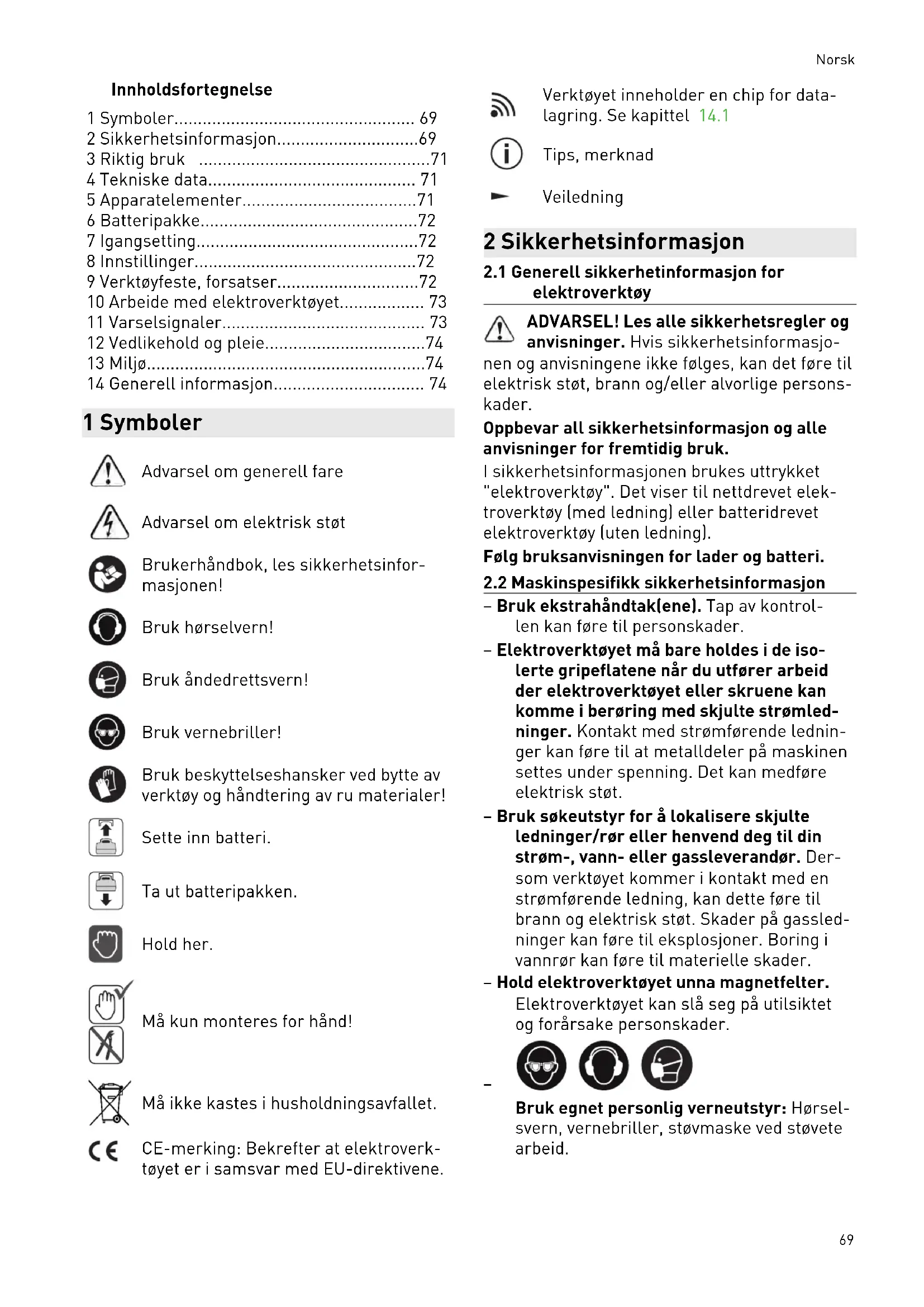 elektroverktøy ADVARSEL! Les alle sikkerhetsregler og anvisninger. Hvis sikkerhetsinformasjo nen og anvisningene ikke følges, kan det føre til elektrisk støt, brann og/eller alvorlige persons kader. Oppbevar all sikkerhetsinformasjon og alle anvisninger for fremtidig bruk. I sikkerhetsinformasjonen brukes uttrykket "elektroverktøy". Det viser til nettdrevet elek troverktøy (med ledning) eller batteridrevet elektroverktøy (uten ledning). Følg bruksanvisningen for lader og batteri.