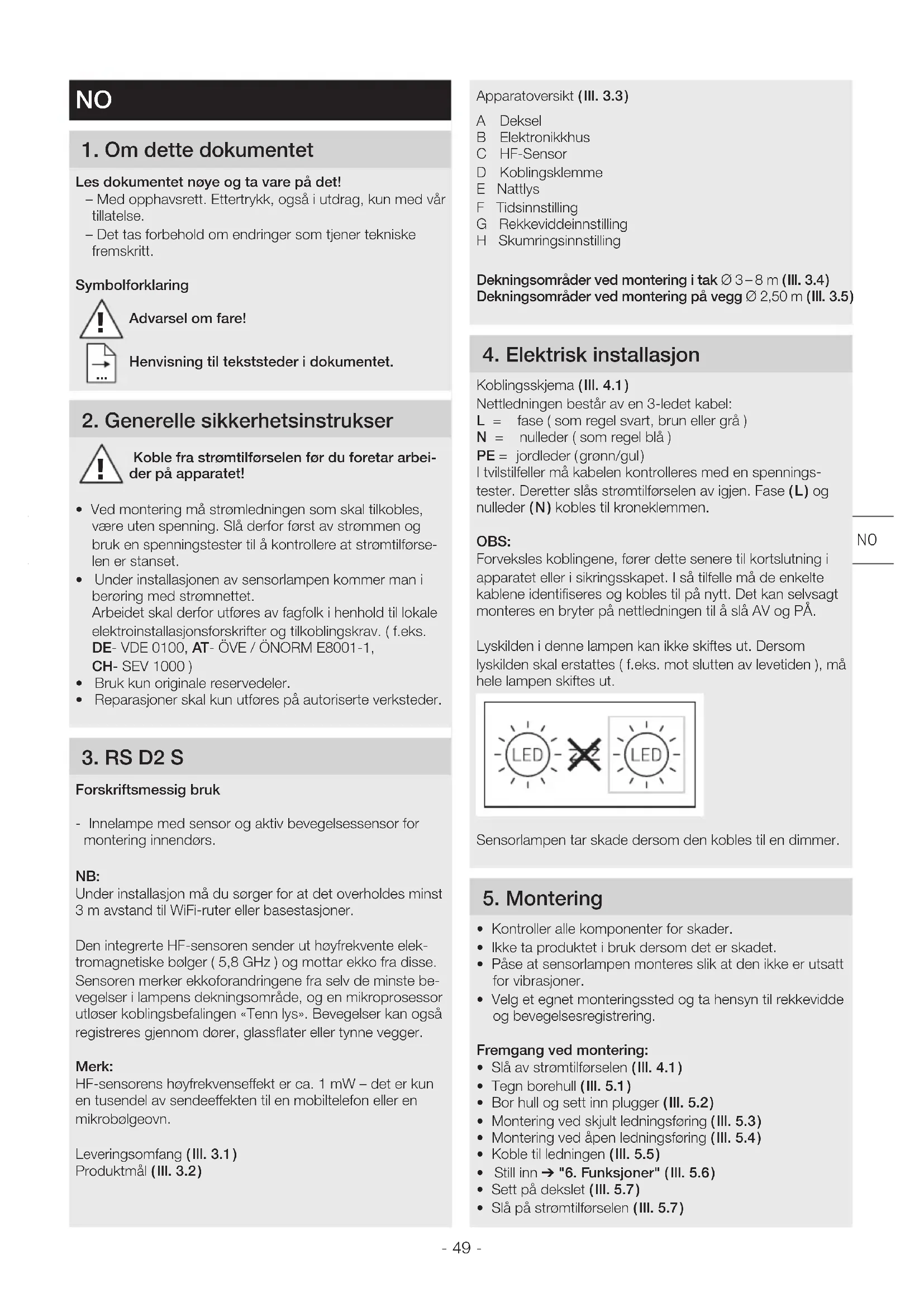 - Ved montering må strømledningen som skal tilkobles, være uten spenning. Slå derfor først av strømmen og bruk en spenningstester til å kontrollere at strømtilførse-len er stanset. • Under installasjonen av sensorlampen kommer man i berøring med strømnettet. Arbeidet skal derfor utføres av fagfolk i henhold til lokale elektroinstallasjonsforskrifter og tilkoblingskrav. ( f.eks. DE- VDE 0100, AT- ÖVE / ÖNORM E8001-1, CH- SEV 1000 )• Bruk kun originale reservedeler.• Reparasjoner skal kun utføres på autoriserte verksteder. 3 RS D2 S Forskriftsmessig bruk- Innelampe med sensor og aktiv bevegelsessensor for montering innendørs. NB: Under installasjon må du sørger for at det overholdes minst 3 m avstand til WiFi-ruter eller basestasjoner.Den integrerte HF-sensoren sender ut høyfrekvente elek-tromagnetiske bølger ( 5,8 GHz ) og mottar ekko fra disse. Sensoren merker ekkoforandringene fra selv de minste be-vegelser i lampens dekningsområde, og en mikroprosessor utløser koblingsbefalingen «Tenn lys». Bevegelser kan også registreres gjennom dører, glassflater eller tynne vegger. Merk: HF-sensorens høyfrekvenseekt er ca. 1mW – det er kun en tusendel av sendeeekten til en mobiltelefon eller en mikrobølgeovn.Leveringsomfang ( Ill31 )Produktmål ( Ill32 )