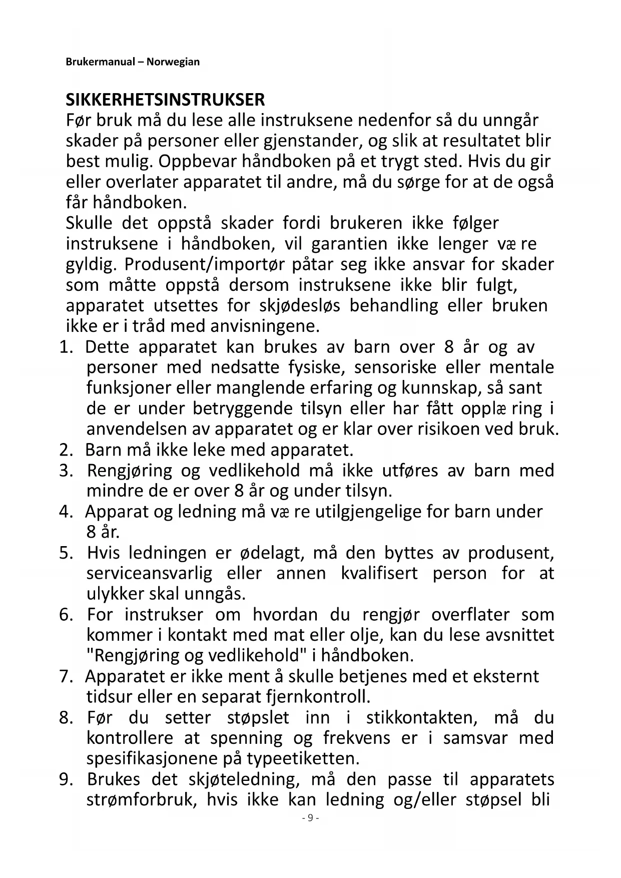 9. Brukes det skjøteledning, må den passe til apparatets