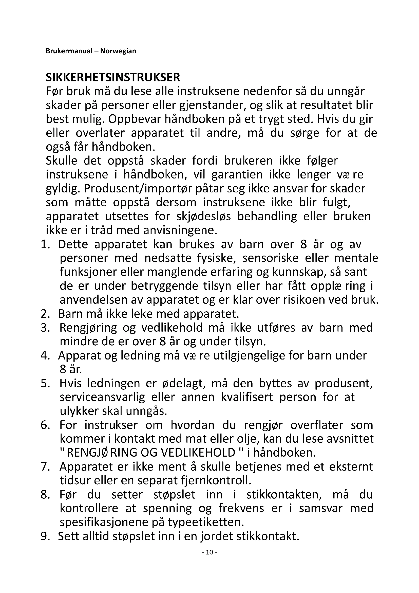 10. Ta støpslet ut av stikkontakten når apparatet ikke er i bruk
