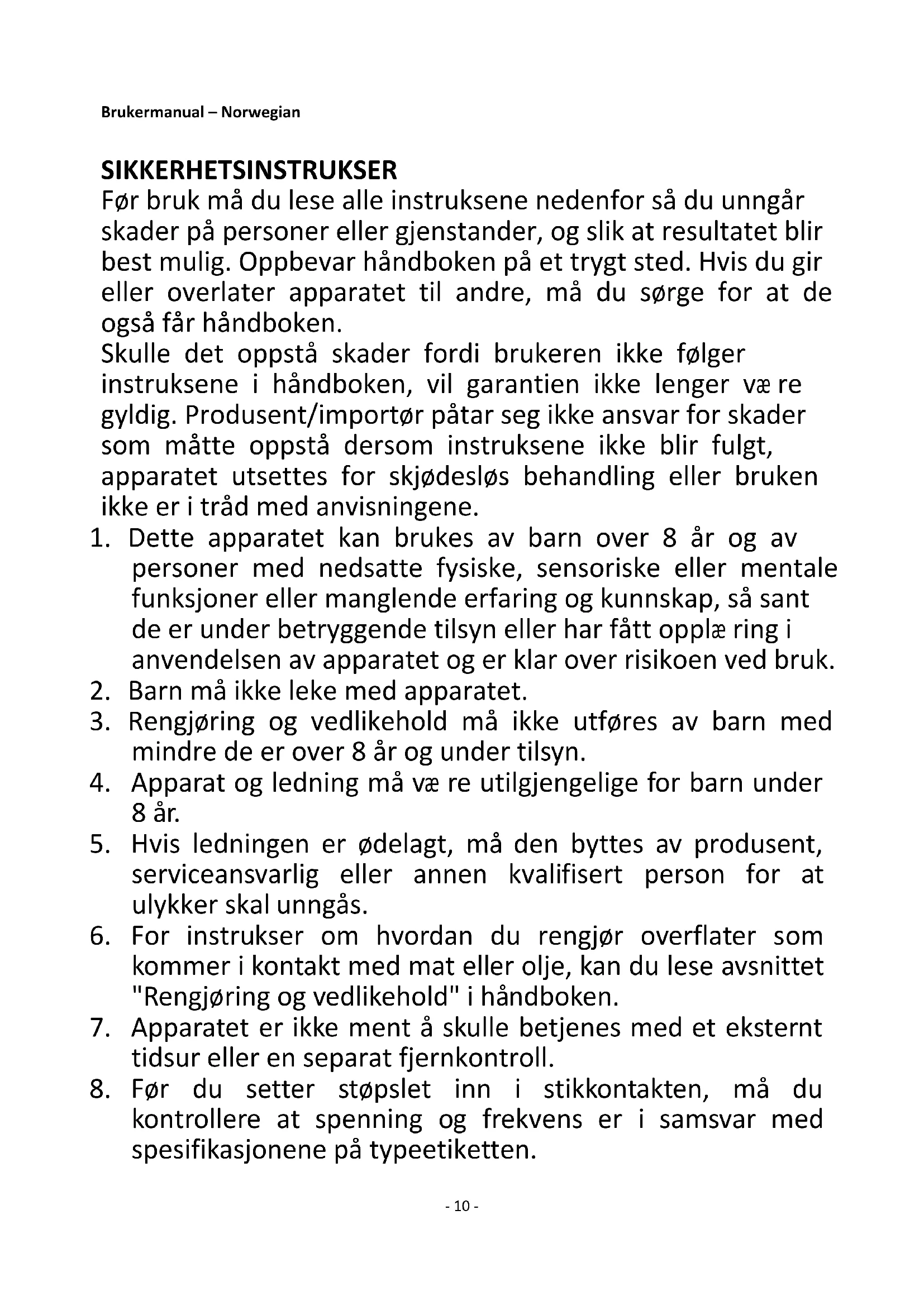 en rengjøringsbørste for å fjerne matrester. Merk: Kurven og stekegrillen kan brukes i oppvaskmaskinen. FEILSØ KING Problem Mulig årsak Løsning Apparatet fungerer ikke. Apparatet er ikke koblet til. Sett støpselet i en jordet stikkontakt. Du har ikke trykket på av / på-knappen for å slå på maskinen. Trykk på av / på-knappen for å slå på apparatet. Ingrediensene er ikke stekt helt. Mengden på maten i kurven er for høy. Legg mindre mengder ingredienser i kurven. Mindre partier avfyres jevnere. Temperaturen er for lav, eller tiden er ikke nok. Trykk “ ” for å justere temperaturen til ønsket temperatur for å steke lengre. Ingrediensene er stekt ujevnt. Ulike typer mat må kanskje ristes halvveis under matlagingen. Rist maten halvveis i koketiden. Stekte snacks er ikke sprø. Du brukte en type snacks som skal tilberedes i en tradisjonell frityrkoker. Bruk ovnsnacks eller pensle litt olje på snacksen for et sprøere resultat. Type Minimum-maksimal mat ingredienser mengde (g) Tid (minutter) Temperatur