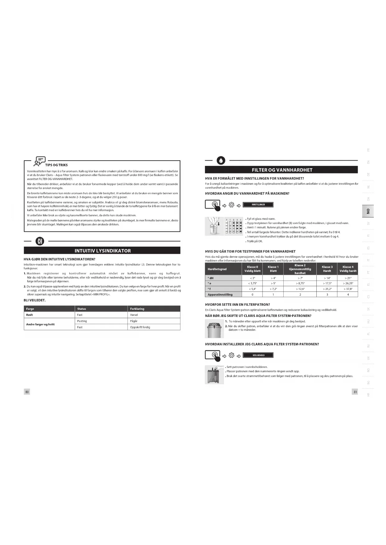 Vannkvaliteten har mye å si for aromaen. Kalk og klor kan endre smaken på kae. For å bevare aromaen i kaen anbefaler vi at du bruker Claris – Aqua Filter System-patronen eller askevann med tørrsto under 800 mg/l (se askens etikett). Se avsnittet FILTER OG VANNHARDHET. Når du tilbereder drikker, anbefaler vi at du bruker forvarmede kopper (ved å holde dem under varmt vann) i passende størrelse for ønsket mengde. De brente kaebønnene kan miste aromaen hvis de ikke blir beskyttet. Vi anbefaler at du bruker en mengde bønner som tilsvarer ditt forbruk i løpet av de neste 2–3 dagene, og at du velger 250 g poser. Kvaliteten på kaebønnene varierer, og smaken er subjektiv. Arabica vil gi deg diskré blomsteraromaer, mens Robusta, som har et høyere koeininnhold, er mer bitter og fyldig. Det er vanlig å blande de to kaetypene for å få en mer balansert kae. Ta kontakt med en kaebrenner hvis du vil ha mer informasjon. Vi anbefaler ikke bruk av oljete og karamelliserte bønner, da dette kan skade maskinen. Malegraden på de malte bønnene påvirker aromaens styrke og kvaliteten på skumlaget. Jo mer nmalte bønnene er, desto jevnere blir skumlaget. Malingen kan også tilpasses den ønskede drikken. INTUITIV LYSINDIKATOR HVA GJØR DEN INTUITIVE LYSINDIKATOREN? Intuition-maskinen har smart teknologi som gjør hverdagen enklere: Intuitiv lysindikator (J). Denne teknologien har to funksjoner: