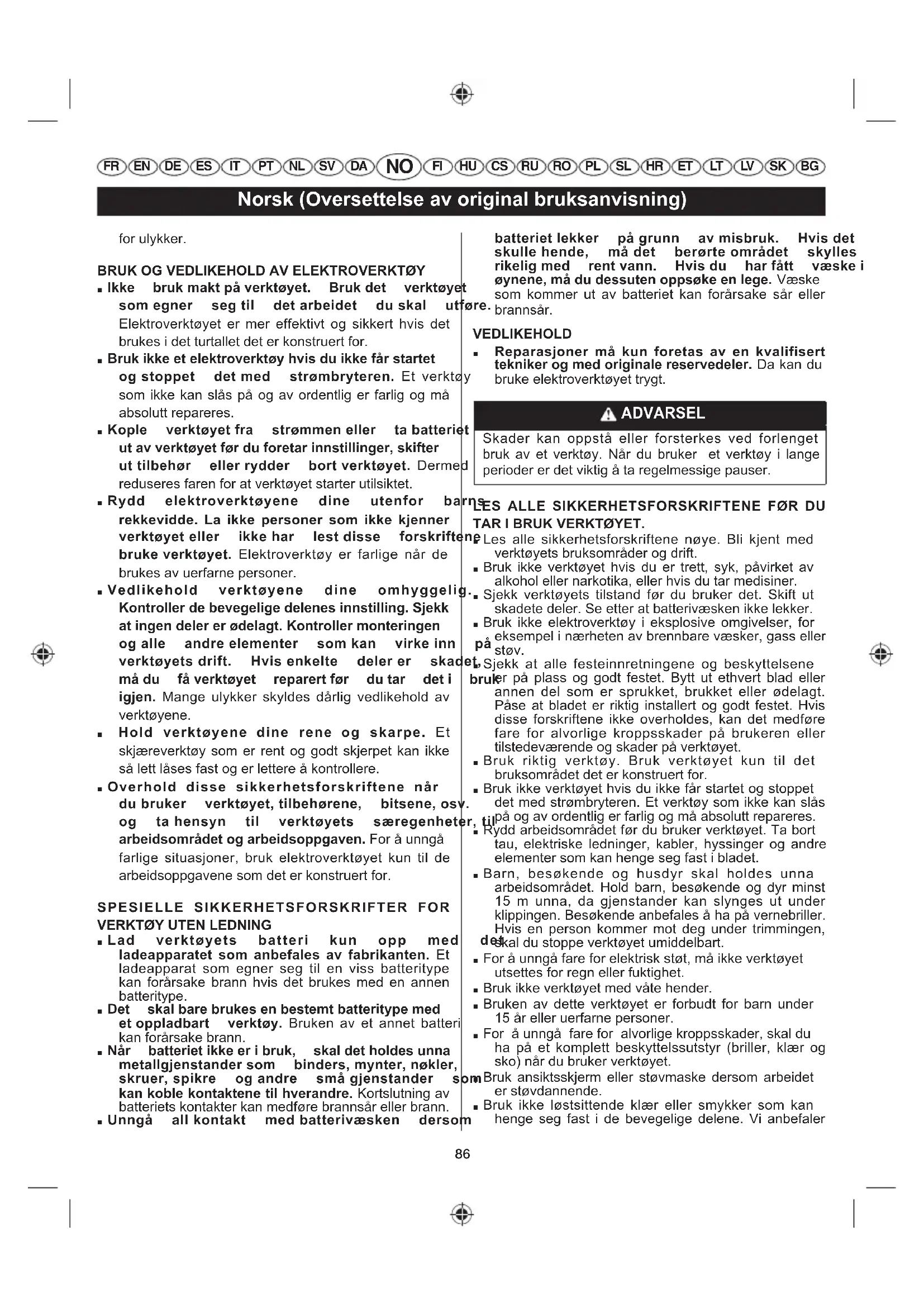 TAR I BRUK VERKTØYET. ■ Les alle sikkerhetsforskriftene nøye. Bli kjent med verktøyets bruksområder og drift. ■ Bruk ikke verktøyet hvis du er trett, syk, påvirket av alkohol eller narkotika, eller hvis du tar medisiner. ■ Sjekk verktøyets tilstand før du bruker det. Skift ut skadete deler. Se etter at batterivæsken ikke lekker. ■ Bruk ikke elektroverktøy i eksplosive omgivelser, for eksempel i nærheten av brennbare væsker, gass eller støv. ■ Sjekk at alle festeinnretningene og beskyttelsene er på plass og godt festet. Bytt ut ethvert blad eller annen del som er sprukket, brukket eller ødelagt. Påse at bladet er riktig installert og godt festet. Hvis disse forskriftene ikke overholdes, kan det medføre fare for alvorlige kroppsskader på brukeren eller tilstedeværende og skader på verktøyet. ■ Bruk riktig verktøy. Bruk verktøyet kun til det bruksområdet det er konstruert for. ■ Bruk ikke verktøyet hvis du ikke får startet og stoppet det med strømbryteren. Et verktøy som ikke kan slås på og av ordentlig er farlig og må absolutt repareres. ■ Rydd arbeidsområdet før du bruker verktøyet. Ta bort tau, elektriske ledninger, kabler, hyssinger og andre elementer som kan henge seg fast i bladet. ■ Barn, besøkende og husdyr skal holdes unna arbeidsområdet. Hold barn, besøkende og dyr minst 15 m unna, da gjenstander kan slynges ut under klippingen. Besøkende anbefales å ha på vernebriller. Hvis en person kommer mot deg under trimmingen, skal du stoppe verktøyet umiddelbart. ■ For å unngå fare for elektrisk støt, må ikke verktøyet utsettes for regn eller fuktighet. ■ Bruk ikke verktøyet med våte hender.■ Bruken av dette verktøyet er forbudt for barn under 15 år eller uerfarne personer. ■ For å unngå fare for alvorlige kroppsskader, skal du ha på et komplett beskyttelssutstyr (briller, klær og sko) når du bruker verktøyet. ■ Bruk ansiktsskjerm eller støvmaske dersom arbeidet er støvdannende. ■ Bruk ikke løstsittende klær eller smykker som kan henge seg fast i de bevegelige delene. Vi anbefaler87 Norsk (Oversettelse av original bruksanvisning)
